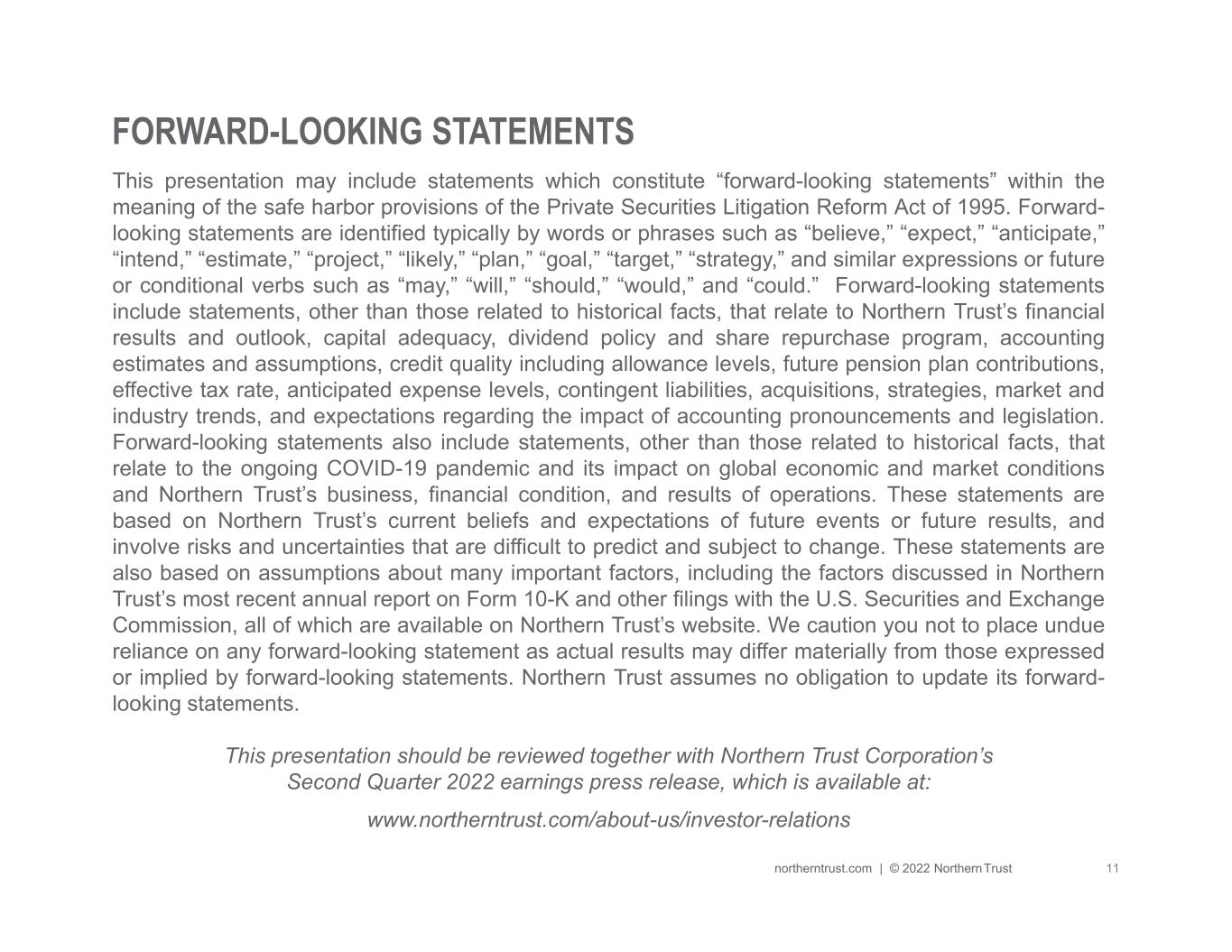 “Northern Trust delivered a solid second quarter financial performance, including revenue growth of 12%, earnings per share growth of 8%, both compared to the prior year, and return on average common equity of 15.7%. The elimination of fee waivers and our continued new business generation contributed to a 6% increase in trust, investment and other servicing fees, while rising interest rates drove a 37% increase in net interest income. Expenses grew 9%, reflecting growth and investment in our business, coupled with continued inflationary pressures. This combination resulted in three points of positive operating leverage compared to the prior year. As announced yesterday, our Board of Directors increased our dividend 7% to $0.75 per share for the third quarter, reflecting the strength of our balance sheet and capital position. As we look to the second half of the year, we remain focused on serving our clients, executing on our long-term growth priorities, and investing prudently for the future.” | ||