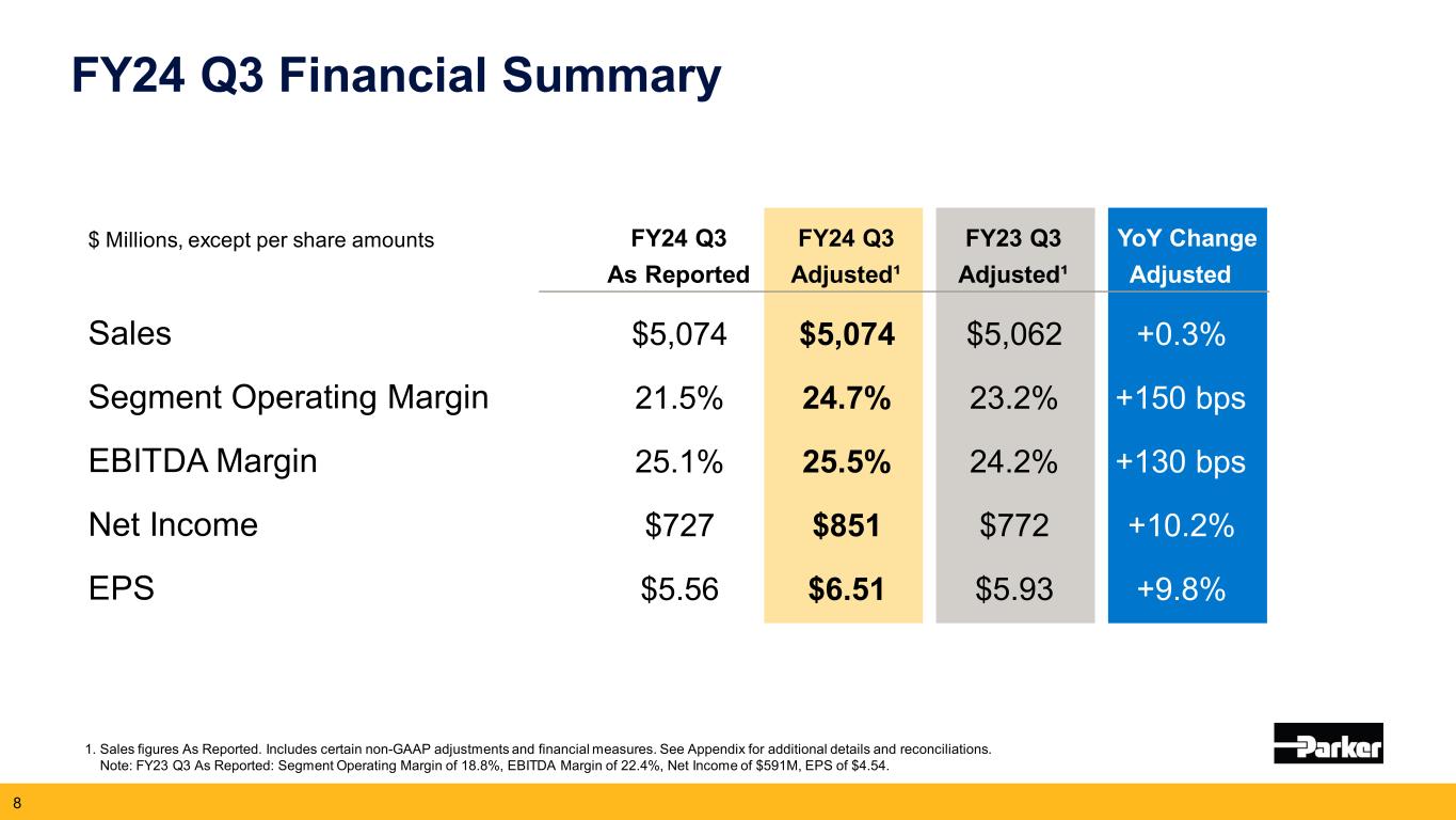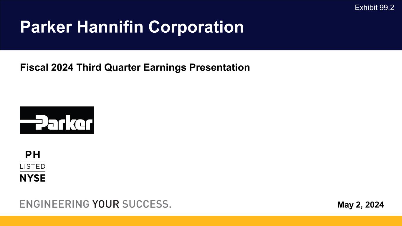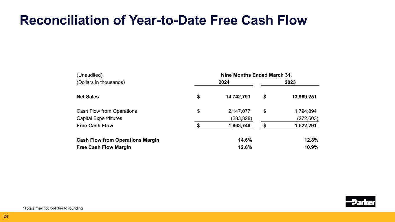 2024年5月2日、クリーブランド発 -- モーション・コントロール技術の世界的リーダーであるパーカー・ハネフィン・コーポレーション(NYSE:PH)は本日、2024年度第3四半期(2024年3月31日終了)の業績を発表した。売上高は50億7,000万ドル(2023年度第3四半期は50億6,000万ドル)。純利益は前年同期の5億9,090万ドルに対し、7億2,660万ドル。調整後純利益は8億5,070万ドルで、2023年度第3四半期の7億7,190万ドルから10%増加した。1株当たり利益は前年同期の4.54ドルに対し5.56ドル。調整後1株当たり利益は、2023年度第3四半期の5.93ドルに対し10%増の6.51ドルとなり、過去最高を記録した。2024年度通期の営業キャッシュフローは、前年度の18億ドル(売上高の12.8%)に対し、20%増の21億ドル(売上高の14.6%)と過去最高を記録した。非GAAP基準の調整表は本プレスリリースの財務表に含まれている。