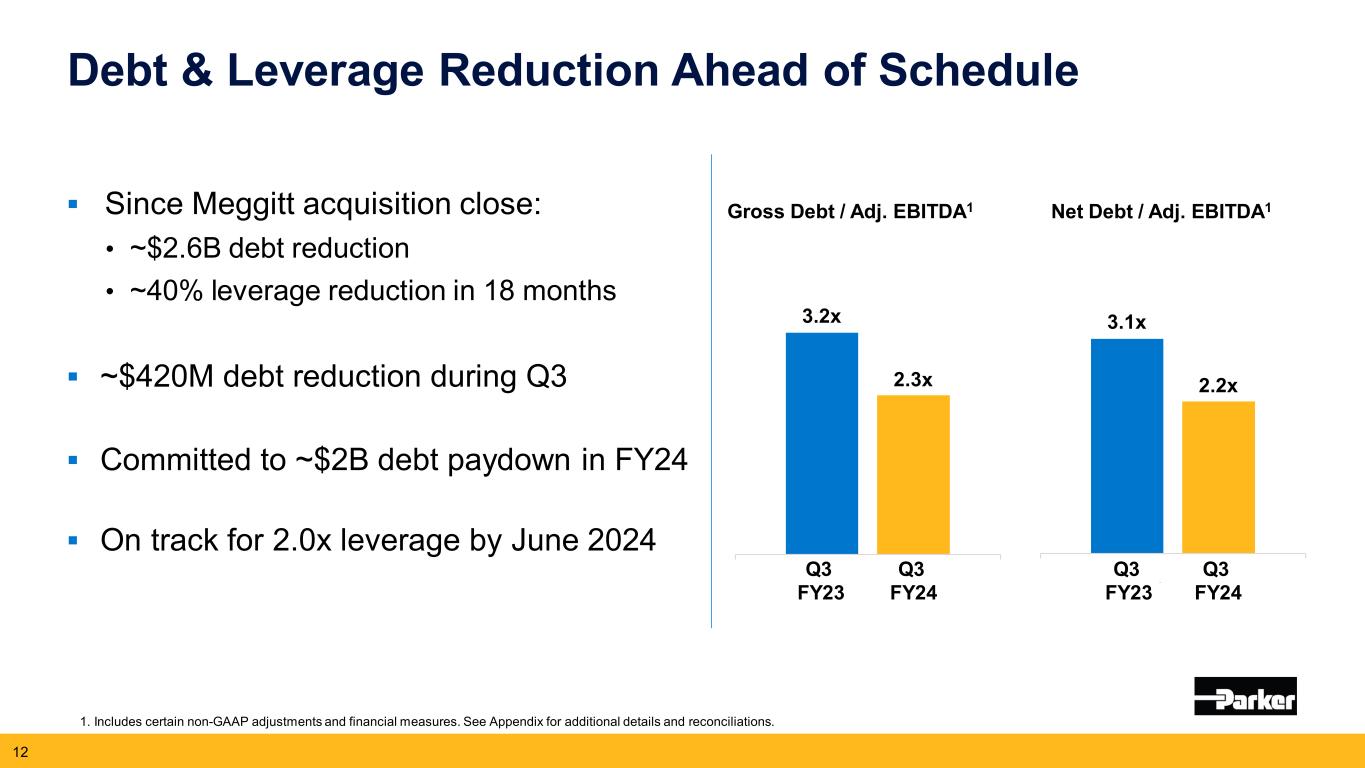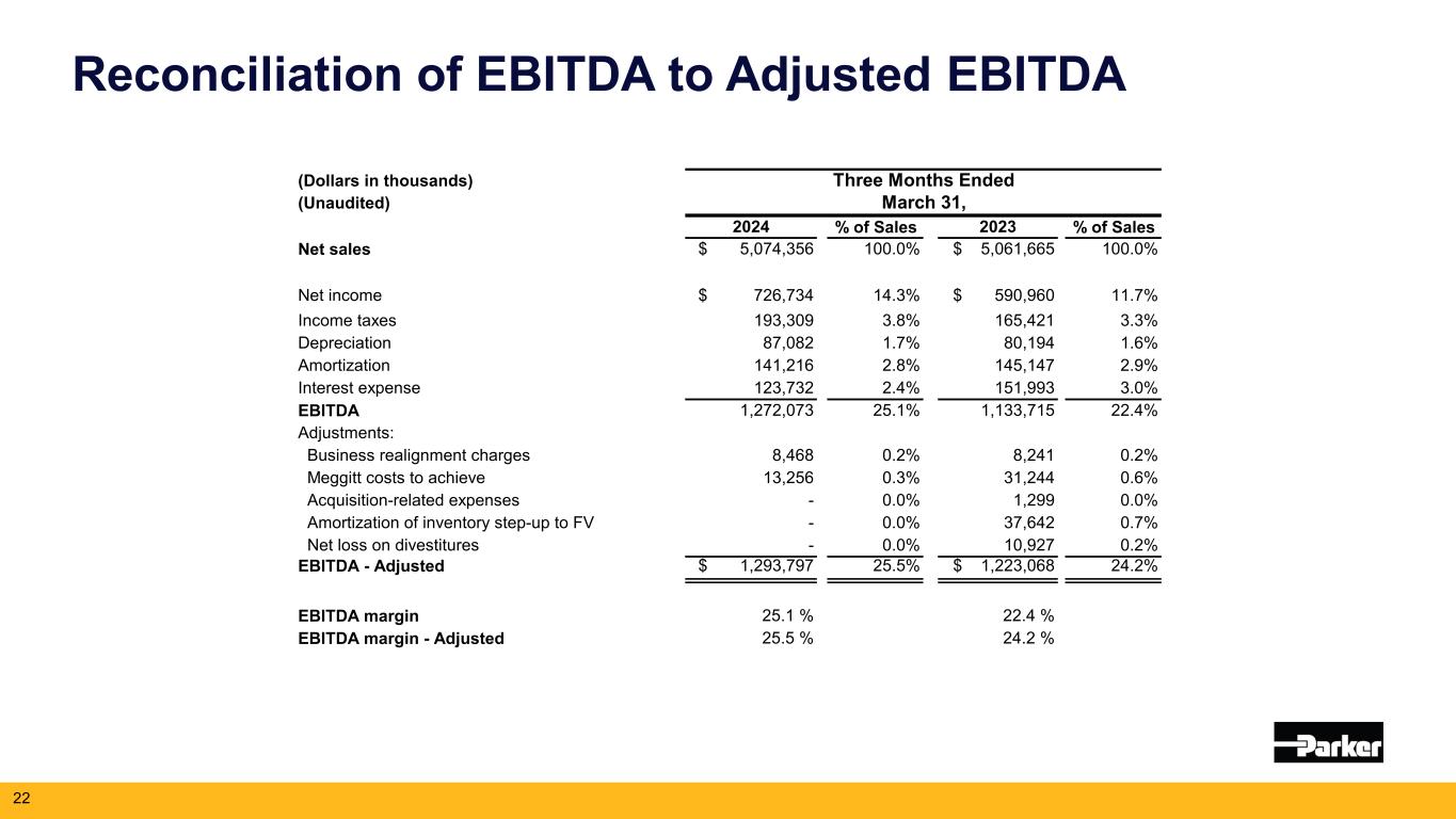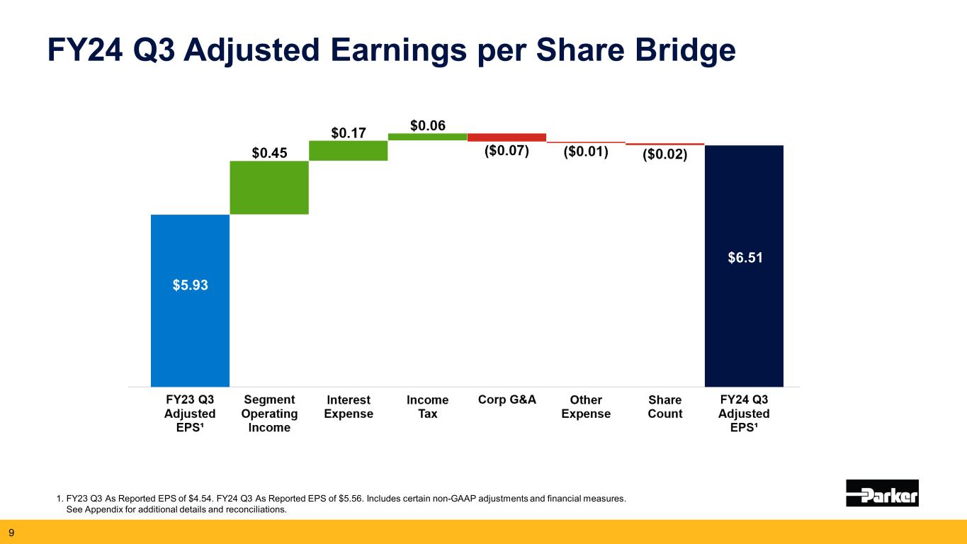 2024年5月2日、クリーブランド発 -- モーション・コントロール技術の世界的リーダーであるパーカー・ハネフィン・コーポレーション(NYSE:PH)は本日、2024年度第3四半期(2024年3月31日終了)の業績を発表した。売上高は50億7,000万ドル(2023年度第3四半期は50億6,000万ドル)。純利益は前年同期の5億9,090万ドルに対し、7億2,660万ドル。調整後純利益は8億5,070万ドルで、2023年度第3四半期の7億7,190万ドルから10%増加した。1株当たり利益は前年同期の4.54ドルに対し5.56ドル。調整後1株当たり利益は、2023年度第3四半期の5.93ドルに対し10%増の6.51ドルとなり、過去最高を記録した。2024年度通期の営業キャッシュフローは、前年度の18億ドル(売上高の12.8%)に対し、20%増の21億ドル(売上高の14.6%)と過去最高を記録した。非GAAP基準の調整表は本プレスリリースの財務表に含まれている。