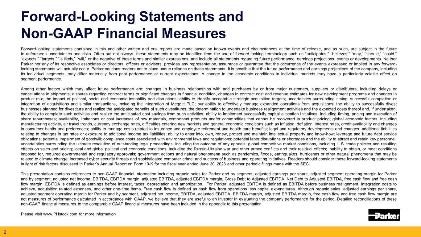 将来の業績に影響を及ぼす可能性のあるその他の要因には、以下が含まれる:出荷の遅延やキャンセルを含む、主要な顧客、サプライヤー、またはディストリビューターとの取引関係の変化およびそれらによる購入、契約条件に関する紛争または財務状況の大幅な変化、新規開発プログラムに関する契約コストおよび収益の見積もりの変更、製品構成の変化、政治的、社会的、経済的な不安定性および混乱による影響、許容可能な戦略的買収ターゲットを特定する能力、Meggitt PLC.の統合を含む買収および同様の取引のタイミング、成功裏の完了、または統合をめぐる不確実性、買収による事業拡大を効果的に管理する能力、分割を予定している事業を首尾よく分割し、そのような分割により期待される利益を実現する能力、分割に着手するかどうかの判断、買収による事業拡大を効果的に管理する能力;買収により拡大した事業を効果的に管理する能力、売却を計画している事業の売却を成功させ、そのような売却により期待される利益を実現する能力、事業再編活動を行うかどうかの決定と予想される費用、および実施する場合、そのような活動を完了させ、そのような活動により期待されるコスト削減を実現する能力、自社株買戻しのタイミング、価格設定、実行を含む資本配分イニシアチブを成功させる能力;製品価格で回収できない原材料、部品製品および/または商品の入手可能性、制限またはコスト上昇、製造活動、航空旅行動向、為替レート、新市場参入の難しさ、インフレ、デフレ、金利、信用の利用可能性、消費者の習慣や嗜好の変化などの一般的な経済状況を含む世界的な経済要因、保険、従業員の退職金および医療給付に関するコストを管理する能力、法律および規制の発展および変更;税率変更に関連する追加債務または追加所得税債務へのエクスポージャー、知的財産およびノウハウの契約、所有、更新、保護および維持能力、レバレッジおよび将来の債務返済義務、のれんの減損の可能性、環境法および規制に関連するコンプライアンス費用、潜在的な労働力の混乱または不足、および主要な人材を惹きつけ維持する能力、控訴の結果を含む未解決の法的手続きの最終的な解決をめぐる不確実性、米国の貿易政策およびその結果としての影響を含む世界的な競争市場の状況。米国の通商政策とその結果としての売上と価格への影響、ロシア・ウクライナ戦争やその他の武力紛争とその残存的影響を含む地域的・世界的な政治・経済状況、必要な政府・規制当局の承認が得られない、またはそのための条件を満たせないこと、政府の行動やパンデミック、洪水、地震、ハリケーン、気候変動に関連する可能性のあるその他の自然現象、サイバーセキュリティの脅威や巧妙なコンピューター犯罪の増加、事業・経営イニシアティブの成功など。読者は、2023年6月30日締めの会計年度に関するパーカーの年次報告書(フォーム10-K)およびSECに定期的に提出されるその他の書類に記載されているリスク要因に照らして、これらの将来の見通しに関する記述を検討する必要があります。