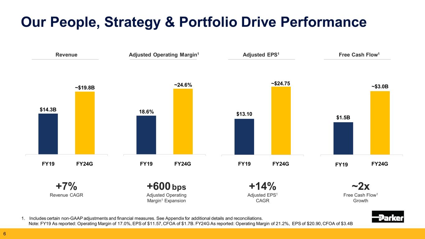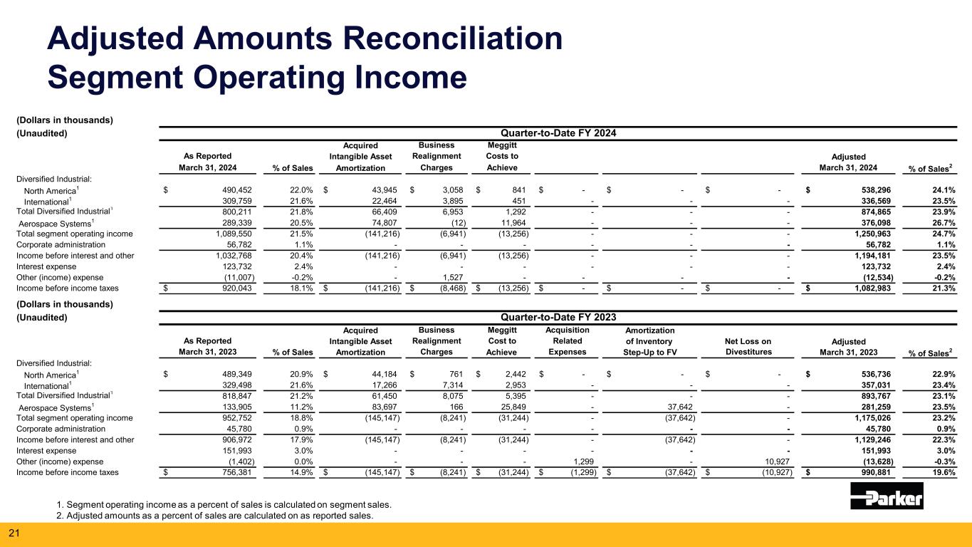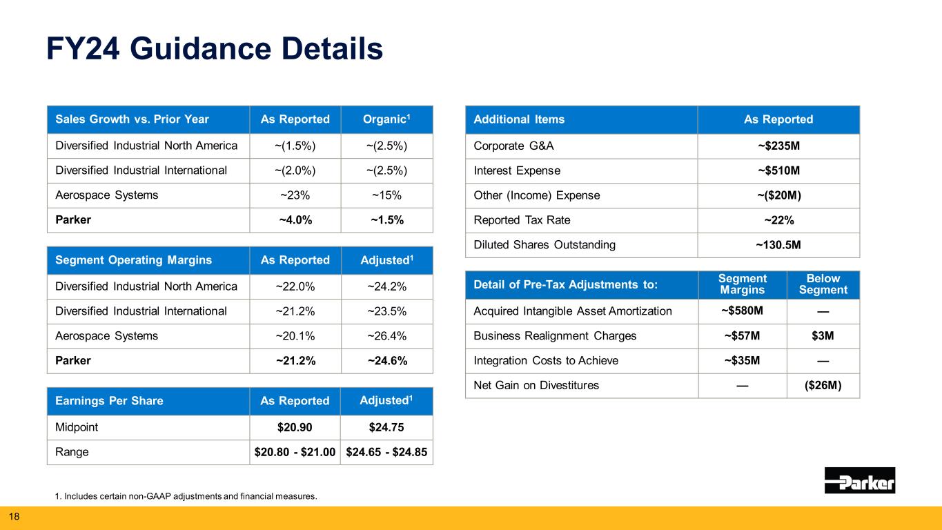 パーカーの2024年6月期の業績見通しが更新された。2024年度の総売上高成長率は約4%、総セグメント営業利益率は約21.2%(調整後ベースでは24.6%)、1株当たり利益は20.80~21.00ドル(調整後ベースでは24.65~24.85ドル)を見込んでいます。予想セグメント営業利益率と調整後予想セグメント営業利益率との調整、および予想1株当たり利益と調整後予想1株当たり利益との調整は、本プレスリリースの財務表に記載されている。