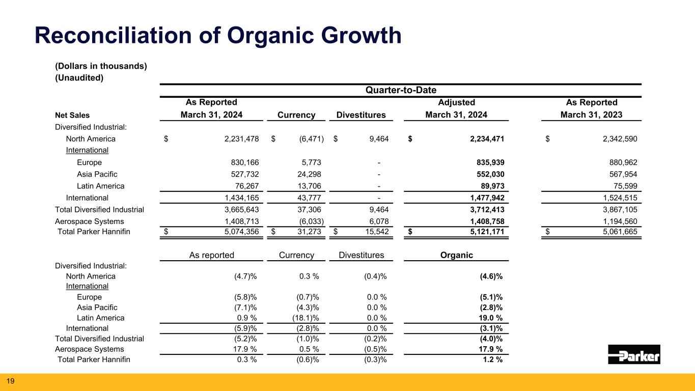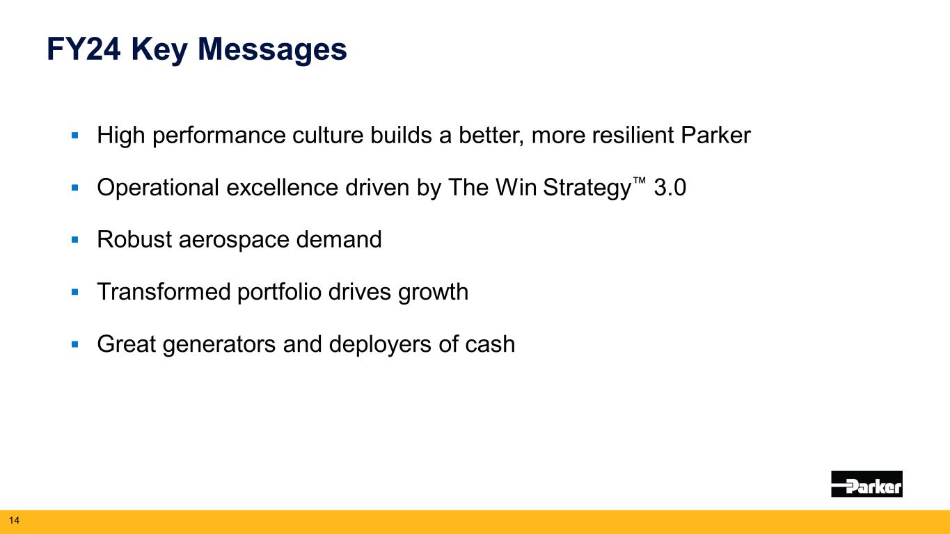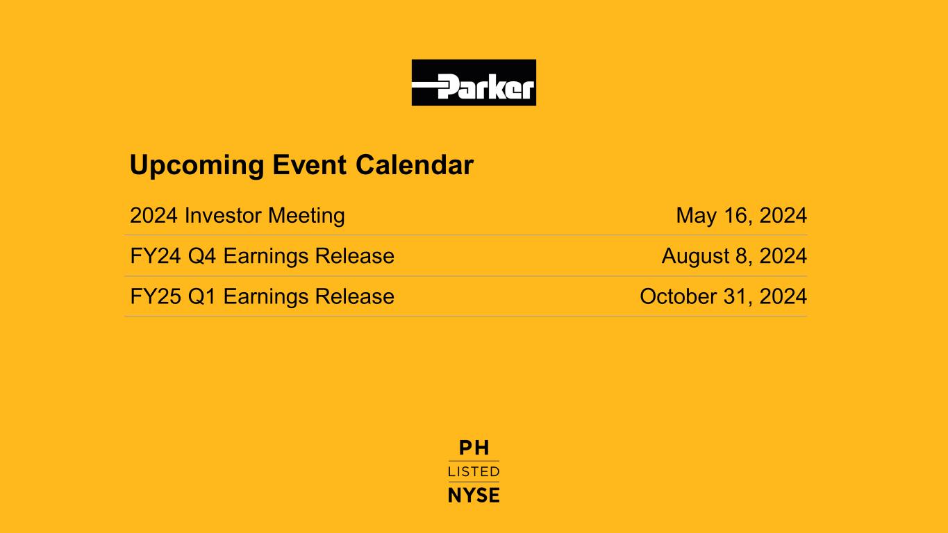 パルマンティエはさらに、次のように述べています。「私たちは、チームメンバーが達成した第3四半期の好調な業績と、航空宇宙分野における2桁の有機的成長に基づいて、2024年度の見通しを引き上げています。パーカーは、The Win Strategy™を実行することで、記録的な業績を上げ続け、株主価値を創造し続けることができる体制を整えています。2024年5月16日に開催予定の投資家向け説明会で、当社の有望な将来について詳しくご説明できることを楽しみにしています。"