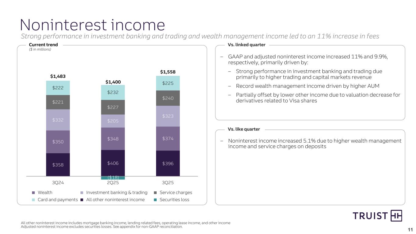 非金利収入は、主に投資銀行事業およびトレーディング収入、ウェルス・マネジメント収入の増加によ り、前年同期から 1.58 億ドル(11%)増加しましたが、その他収入の減少により一部相殺されました。有価証券損失を除くと、非金利収入は前年同期から 1.4 億ドル(9.9%)増加しました。