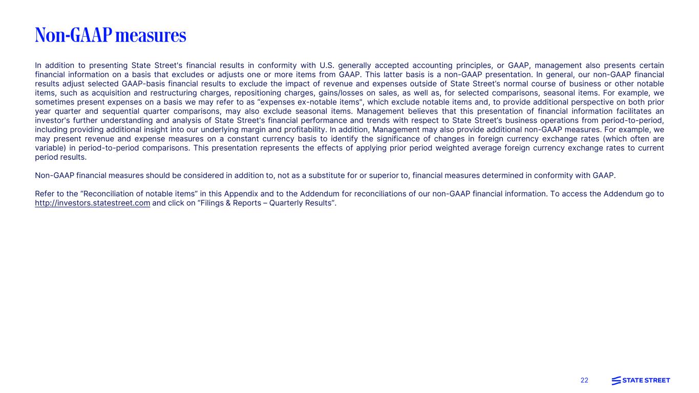-投資サービシング事業の AUC/A(四半期末現在)は、主に四半期末の市場水準、フロー、および為替変動の影響 の増加により、11%増の 49.0 兆ドルとなった。