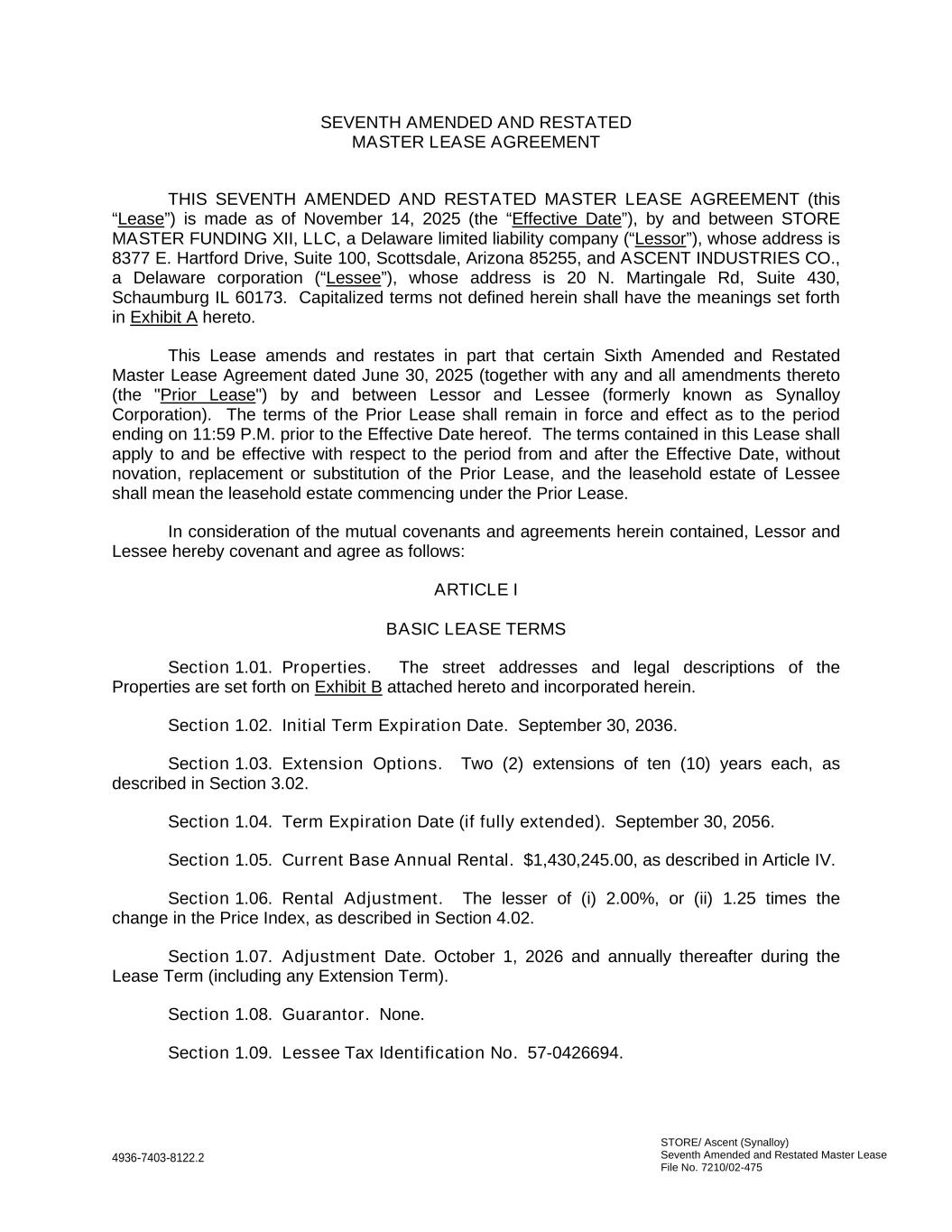 STORE/ Ascent (Synalloy) Seventh Amended and Restated Master Lease File No. 7210/02-475 4936-7403-8122.2 SEVENTH AMENDED AND RESTATED MASTER LEASE AGREEMENT THIS SEVENTH AMENDED AND RESTATED MASTER LEASE AGREEMENT (this “Lease”) is made as of November 14, 2025 (the “Effective Date”), by and between STORE MASTER FUNDING XII, LLC, a Delaware limited liability company (“Lessor”), whose address is 8377 E. Hartford Drive, Suite 100, Scottsdale, Arizona 85255, and ASCENT INDUSTRIES CO., a Delaware corporation (“Lessee”), whose address is 20 N. Martingale Rd, Suite 430, Schaumburg IL 60173. Capitalized terms not defined herein shall have the meanings set forth in Exhibit A hereto. This Lease amends and restates in part that certain Sixth Amended and Restated Master Lease Agreement dated June 30, 2025 (together with any and all amendments thereto (the "Prior Lease") by and between Lessor and Lessee (formerly known as Synalloy Corporation). The terms of the Prior Lease shall remain in force and effect as to the period ending on 11:59 P.M. prior to the Effective Date hereof. The terms contained in this Lease shall apply to and be effective with respect to the period from and after the Effective Date, without novation, replacement or substitution of the Prior Lease, and the leasehold estate of Lessee shall mean the leasehold estate commencing under the Prior Lease. In consideration of the mutual covenants and agreements herein contained, Lessor and Lessee hereby covenant and agree as follows: ARTICLE I BASIC LEASE TERMS Section 1.01. Properties. The street addresses and legal descriptions of the Properties are set forth on Exhibit B attached hereto and incorporated herein. Section 1.02. Initial Term Expiration Date. September 30, 2036. Section 1.03. Extension Options. Two (2) extensions of ten (10) years each, as described in Section 3.02. Section 1.04. Term Expiration Date (if fully extended). September 30, 2056. Section 1.05. Current Base Annual Rental. $1,430,245.00, as described in Article IV. Section 1.06. Rental Adjustment. The lesser of (i) 2.00%, or (ii) 1.25 times the change in the Price Index, as described in Section 4.02. Section 1.07. Adjustment Date. October 1, 2026 and annually thereafter during the Lease Term (including any Extension Term). Section 1.08. Guarantor. None. Section 1.09. Lessee Tax Identification No. 57-0426694.