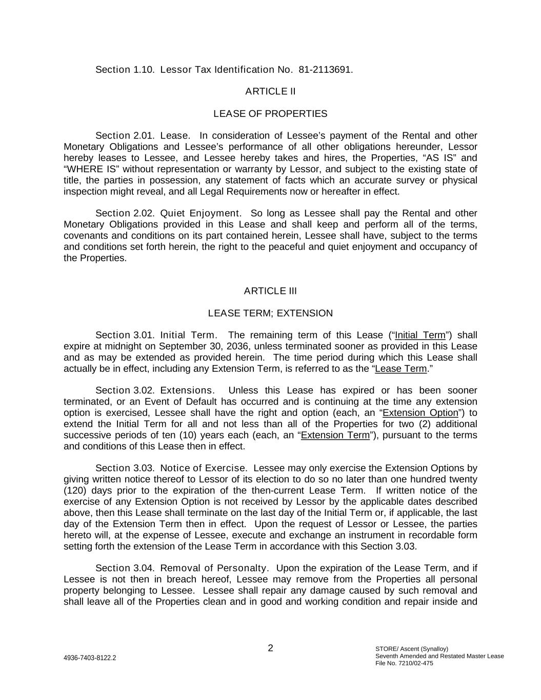 STORE/ Ascent (Synalloy) Seventh Amended and Restated Master Lease File No. 7210/02-475 2 4936-7403-8122.2 Section 1.10. Lessor Tax Identification No. 81-2113691. ARTICLE II LEASE OF PROPERTIES Section 2.01. Lease. In consideration of Lessee’s payment of the Rental and other Monetary Obligations and Lessee’s performance of all other obligations hereunder, Lessor hereby leases to Lessee, and Lessee hereby takes and hires, the Properties, “AS IS” and “WHERE IS” without representation or warranty by Lessor, and subject to the existing state of title, the parties in possession, any statement of facts which an accurate survey or physical inspection might reveal, and all Legal Requirements now or hereafter in effect. Section 2.02. Quiet Enjoyment. So long as Lessee shall pay the Rental and other Monetary Obligations provided in this Lease and shall keep and perform all of the terms, covenants and conditions on its part contained herein, Lessee shall have, subject to the terms and conditions set forth herein, the right to the peaceful and quiet enjoyment and occupancy of the Properties. ARTICLE III LEASE TERM; EXTENSION Section 3.01. Initial Term. The remaining term of this Lease (“Initial Term”) shall expire at midnight on September 30, 2036, unless terminated sooner as provided in this Lease and as may be extended as provided herein. The time period during which this Lease shall actually be in effect, including any Extension Term, is referred to as the “Lease Term.” Section 3.02. Extensions. Unless this Lease has expired or has been sooner terminated, or an Event of Default has occurred and is continuing at the time any extension option is exercised, Lessee shall have the right and option (each, an “Extension Option”) to extend the Initial Term for all and not less than all of the Properties for two (2) additional successive periods of ten (10) years each (each, an “Extension Term”), pursuant to the terms and conditions of this Lease then in effect. Section 3.03. Notice of Exercise. Lessee may only exercise the Extension Options by giving written notice thereof to Lessor of its election to do so no later than one hundred twenty (120) days prior to the expiration of the then-current Lease Term. If written notice of the exercise of any Extension Option is not received by Lessor by the applicable dates described above, then this Lease shall terminate on the last day of the Initial Term or, if applicable, the last day of the Extension Term then in effect. Upon the request of Lessor or Lessee, the parties hereto will, at the expense of Lessee, execute and exchange an instrument in recordable form setting forth the extension of the Lease Term in accordance with this Section 3.03. Section 3.04. Removal of Personalty. Upon the expiration of the Lease Term, and if Lessee is not then in breach hereof, Lessee may remove from the Properties all personal property belonging to Lessee. Lessee shall repair any damage caused by such removal and shall leave all of the Properties clean and in good and working condition and repair inside and