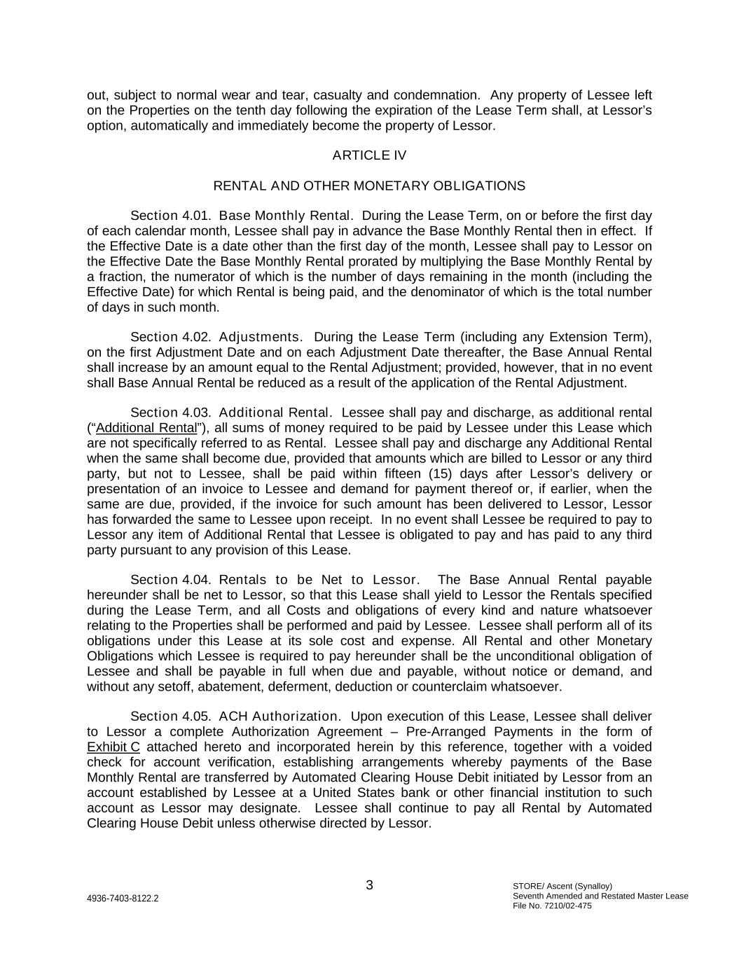 STORE/ Ascent (Synalloy) Seventh Amended and Restated Master Lease File No. 7210/02-475 3 4936-7403-8122.2 out, subject to normal wear and tear, casualty and condemnation. Any property of Lessee left on the Properties on the tenth day following the expiration of the Lease Term shall, at Lessor’s option, automatically and immediately become the property of Lessor. ARTICLE IV RENTAL AND OTHER MONETARY OBLIGATIONS Section 4.01. Base Monthly Rental. During the Lease Term, on or before the first day of each calendar month, Lessee shall pay in advance the Base Monthly Rental then in effect. If the Effective Date is a date other than the first day of the month, Lessee shall pay to Lessor on the Effective Date the Base Monthly Rental prorated by multiplying the Base Monthly Rental by a fraction, the numerator of which is the number of days remaining in the month (including the Effective Date) for which Rental is being paid, and the denominator of which is the total number of days in such month. Section 4.02. Adjustments. During the Lease Term (including any Extension Term), on the first Adjustment Date and on each Adjustment Date thereafter, the Base Annual Rental shall increase by an amount equal to the Rental Adjustment; provided, however, that in no event shall Base Annual Rental be reduced as a result of the application of the Rental Adjustment. Section 4.03. Additional Rental. Lessee shall pay and discharge, as additional rental (“Additional Rental”), all sums of money required to be paid by Lessee under this Lease which are not specifically referred to as Rental. Lessee shall pay and discharge any Additional Rental when the same shall become due, provided that amounts which are billed to Lessor or any third party, but not to Lessee, shall be paid within fifteen (15) days after Lessor’s delivery or presentation of an invoice to Lessee and demand for payment thereof or, if earlier, when the same are due, provided, if the invoice for such amount has been delivered to Lessor, Lessor has forwarded the same to Lessee upon receipt. In no event shall Lessee be required to pay to Lessor any item of Additional Rental that Lessee is obligated to pay and has paid to any third party pursuant to any provision of this Lease. Section 4.04. Rentals to be Net to Lessor. The Base Annual Rental payable hereunder shall be net to Lessor, so that this Lease shall yield to Lessor the Rentals specified during the Lease Term, and all Costs and obligations of every kind and nature whatsoever relating to the Properties shall be performed and paid by Lessee. Lessee shall perform all of its obligations under this Lease at its sole cost and expense. All Rental and other Monetary Obligations which Lessee is required to pay hereunder shall be the unconditional obligation of Lessee and shall be payable in full when due and payable, without notice or demand, and without any setoff, abatement, deferment, deduction or counterclaim whatsoever. Section 4.05. ACH Authorization. Upon execution of this Lease, Lessee shall deliver to Lessor a complete Authorization Agreement – Pre-Arranged Payments in the form of Exhibit C attached hereto and incorporated herein by this reference, together with a voided check for account verification, establishing arrangements whereby payments of the Base Monthly Rental are transferred by Automated Clearing House Debit initiated by Lessor from an account established by Lessee at a United States bank or other financial institution to such account as Lessor may designate. Lessee shall continue to pay all Rental by Automated Clearing House Debit unless otherwise directed by Lessor.