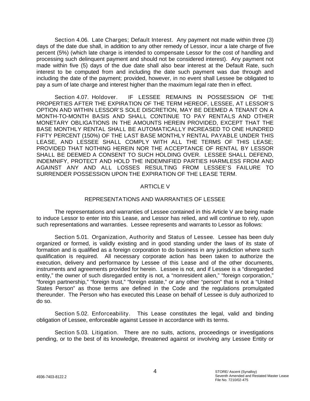 STORE/ Ascent (Synalloy) Seventh Amended and Restated Master Lease File No. 7210/02-475 4 4936-7403-8122.2 Section 4.06. Late Charges; Default Interest. Any payment not made within three (3) days of the date due shall, in addition to any other remedy of Lessor, incur a late charge of five percent (5%) (which late charge is intended to compensate Lessor for the cost of handling and processing such delinquent payment and should not be considered interest). Any payment not made within five (5) days of the due date shall also bear interest at the Default Rate, such interest to be computed from and including the date such payment was due through and including the date of the payment; provided, however, in no event shall Lessee be obligated to pay a sum of late charge and interest higher than the maximum legal rate then in effect. Section 4.07. Holdover. IF LESSEE REMAINS IN POSSESSION OF THE PROPERTIES AFTER THE EXPIRATION OF THE TERM HEREOF, LESSEE, AT LESSOR’S OPTION AND WITHIN LESSOR’S SOLE DISCRETION, MAY BE DEEMED A TENANT ON A MONTH-TO-MONTH BASIS AND SHALL CONTINUE TO PAY RENTALS AND OTHER MONETARY OBLIGATIONS IN THE AMOUNTS HEREIN PROVIDED, EXCEPT THAT THE BASE MONTHLY RENTAL SHALL BE AUTOMATICALLY INCREASED TO ONE HUNDRED FIFTY PERCENT (150%) OF THE LAST BASE MONTHLY RENTAL PAYABLE UNDER THIS LEASE, AND LESSEE SHALL COMPLY WITH ALL THE TERMS OF THIS LEASE; PROVIDED THAT NOTHING HEREIN NOR THE ACCEPTANCE OF RENTAL BY LESSOR SHALL BE DEEMED A CONSENT TO SUCH HOLDING OVER. LESSEE SHALL DEFEND, INDEMNIFY, PROTECT AND HOLD THE INDEMNIFIED PARTIES HARMLESS FROM AND AGAINST ANY AND ALL LOSSES RESULTING FROM LESSEE’S FAILURE TO SURRENDER POSSESSION UPON THE EXPIRATION OF THE LEASE TERM. ARTICLE V REPRESENTATIONS AND WARRANTIES OF LESSEE The representations and warranties of Lessee contained in this Article V are being made to induce Lessor to enter into this Lease, and Lessor has relied, and will continue to rely, upon such representations and warranties. Lessee represents and warrants to Lessor as follows: Section 5.01. Organization, Authority and Status of Lessee. Lessee has been duly organized or formed, is validly existing and in good standing under the laws of its state of formation and is qualified as a foreign corporation to do business in any jurisdiction where such qualification is required. All necessary corporate action has been taken to authorize the execution, delivery and performance by Lessee of this Lease and of the other documents, instruments and agreements provided for herein. Lessee is not, and if Lessee is a “disregarded entity,” the owner of such disregarded entity is not, a “nonresident alien,” “foreign corporation,” “foreign partnership,” “foreign trust,” “foreign estate,” or any other “person” that is not a “United States Person” as those terms are defined in the Code and the regulations promulgated thereunder. The Person who has executed this Lease on behalf of Lessee is duly authorized to do so. Section 5.02. Enforceability. This Lease constitutes the legal, valid and binding obligation of Lessee, enforceable against Lessee in accordance with its terms. Section 5.03. Litigation. There are no suits, actions, proceedings or investigations pending, or to the best of its knowledge, threatened against or involving any Lessee Entity or