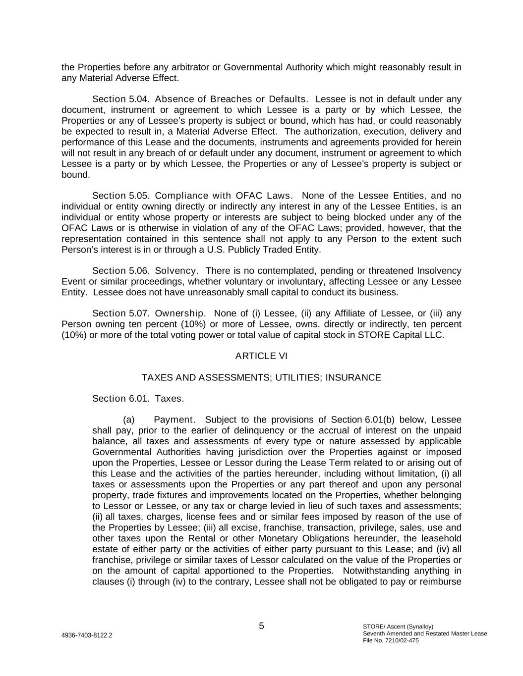 STORE/ Ascent (Synalloy) Seventh Amended and Restated Master Lease File No. 7210/02-475 5 4936-7403-8122.2 the Properties before any arbitrator or Governmental Authority which might reasonably result in any Material Adverse Effect. Section 5.04. Absence of Breaches or Defaults. Lessee is not in default under any document, instrument or agreement to which Lessee is a party or by which Lessee, the Properties or any of Lessee’s property is subject or bound, which has had, or could reasonably be expected to result in, a Material Adverse Effect. The authorization, execution, delivery and performance of this Lease and the documents, instruments and agreements provided for herein will not result in any breach of or default under any document, instrument or agreement to which Lessee is a party or by which Lessee, the Properties or any of Lessee’s property is subject or bound. Section 5.05. Compliance with OFAC Laws. None of the Lessee Entities, and no individual or entity owning directly or indirectly any interest in any of the Lessee Entities, is an individual or entity whose property or interests are subject to being blocked under any of the OFAC Laws or is otherwise in violation of any of the OFAC Laws; provided, however, that the representation contained in this sentence shall not apply to any Person to the extent such Person’s interest is in or through a U.S. Publicly Traded Entity. Section 5.06. Solvency. There is no contemplated, pending or threatened Insolvency Event or similar proceedings, whether voluntary or involuntary, affecting Lessee or any Lessee Entity. Lessee does not have unreasonably small capital to conduct its business. Section 5.07. Ownership. None of (i) Lessee, (ii) any Affiliate of Lessee, or (iii) any Person owning ten percent (10%) or more of Lessee, owns, directly or indirectly, ten percent (10%) or more of the total voting power or total value of capital stock in STORE Capital LLC. ARTICLE VI TAXES AND ASSESSMENTS; UTILITIES; INSURANCE Section 6.01. Taxes. (a) Payment. Subject to the provisions of Section 6.01(b) below, Lessee shall pay, prior to the earlier of delinquency or the accrual of interest on the unpaid balance, all taxes and assessments of every type or nature assessed by applicable Governmental Authorities having jurisdiction over the Properties against or imposed upon the Properties, Lessee or Lessor during the Lease Term related to or arising out of this Lease and the activities of the parties hereunder, including without limitation, (i) all taxes or assessments upon the Properties or any part thereof and upon any personal property, trade fixtures and improvements located on the Properties, whether belonging to Lessor or Lessee, or any tax or charge levied in lieu of such taxes and assessments; (ii) all taxes, charges, license fees and or similar fees imposed by reason of the use of the Properties by Lessee; (iii) all excise, franchise, transaction, privilege, sales, use and other taxes upon the Rental or other Monetary Obligations hereunder, the leasehold estate of either party or the activities of either party pursuant to this Lease; and (iv) all franchise, privilege or similar taxes of Lessor calculated on the value of the Properties or on the amount of capital apportioned to the Properties. Notwithstanding anything in clauses (i) through (iv) to the contrary, Lessee shall not be obligated to pay or reimburse