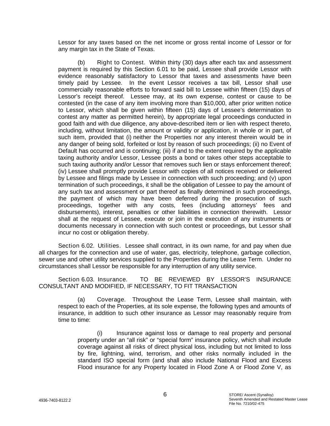 STORE/ Ascent (Synalloy) Seventh Amended and Restated Master Lease File No. 7210/02-475 6 4936-7403-8122.2 Lessor for any taxes based on the net income or gross rental income of Lessor or for any margin tax in the State of Texas. (b) Right to Contest. Within thirty (30) days after each tax and assessment payment is required by this Section 6.01 to be paid, Lessee shall provide Lessor with evidence reasonably satisfactory to Lessor that taxes and assessments have been timely paid by Lessee. In the event Lessor receives a tax bill, Lessor shall use commercially reasonable efforts to forward said bill to Lessee within fifteen (15) days of Lessor’s receipt thereof. Lessee may, at its own expense, contest or cause to be contested (in the case of any item involving more than $10,000, after prior written notice to Lessor, which shall be given within fifteen (15) days of Lessee’s determination to contest any matter as permitted herein), by appropriate legal proceedings conducted in good faith and with due diligence, any above-described item or lien with respect thereto, including, without limitation, the amount or validity or application, in whole or in part, of such item, provided that (i) neither the Properties nor any interest therein would be in any danger of being sold, forfeited or lost by reason of such proceedings; (ii) no Event of Default has occurred and is continuing; (iii) if and to the extent required by the applicable taxing authority and/or Lessor, Lessee posts a bond or takes other steps acceptable to such taxing authority and/or Lessor that removes such lien or stays enforcement thereof; (iv) Lessee shall promptly provide Lessor with copies of all notices received or delivered by Lessee and filings made by Lessee in connection with such proceeding; and (v) upon termination of such proceedings, it shall be the obligation of Lessee to pay the amount of any such tax and assessment or part thereof as finally determined in such proceedings, the payment of which may have been deferred during the prosecution of such proceedings, together with any costs, fees (including attorneys’ fees and disbursements), interest, penalties or other liabilities in connection therewith. Lessor shall at the request of Lessee, execute or join in the execution of any instruments or documents necessary in connection with such contest or proceedings, but Lessor shall incur no cost or obligation thereby. Section 6.02. Utilities. Lessee shall contract, in its own name, for and pay when due all charges for the connection and use of water, gas, electricity, telephone, garbage collection, sewer use and other utility services supplied to the Properties during the Lease Term. Under no circumstances shall Lessor be responsible for any interruption of any utility service. Section 6.03. Insurance. TO BE REVIEWED BY LESSOR’S INSURANCE CONSULTANT AND MODIFIED, IF NECESSARY, TO FIT TRANSACTION (a) Coverage. Throughout the Lease Term, Lessee shall maintain, with respect to each of the Properties, at its sole expense, the following types and amounts of insurance, in addition to such other insurance as Lessor may reasonably require from time to time: (i) Insurance against loss or damage to real property and personal property under an “all risk” or “special form” insurance policy, which shall include coverage against all risks of direct physical loss, including but not limited to loss by fire, lightning, wind, terrorism, and other risks normally included in the standard ISO special form (and shall also include National Flood and Excess Flood insurance for any Property located in Flood Zone A or Flood Zone V, as