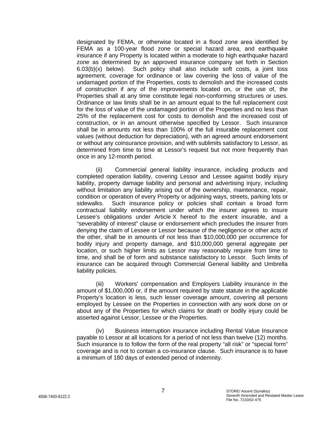 STORE/ Ascent (Synalloy) Seventh Amended and Restated Master Lease File No. 7210/02-475 7 4936-7403-8122.2 designated by FEMA, or otherwise located in a flood zone area identified by FEMA as a 100-year flood zone or special hazard area, and earthquake insurance if any Property is located within a moderate to high earthquake hazard zone as determined by an approved insurance company set forth in Section 6.03(b)(x) below). Such policy shall also include soft costs, a joint loss agreement, coverage for ordinance or law covering the loss of value of the undamaged portion of the Properties, costs to demolish and the increased costs of construction if any of the improvements located on, or the use of, the Properties shall at any time constitute legal non-conforming structures or uses. Ordinance or law limits shall be in an amount equal to the full replacement cost for the loss of value of the undamaged portion of the Properties and no less than 25% of the replacement cost for costs to demolish and the increased cost of construction, or in an amount otherwise specified by Lessor. Such insurance shall be in amounts not less than 100% of the full insurable replacement cost values (without deduction for depreciation), with an agreed amount endorsement or without any coinsurance provision, and with sublimits satisfactory to Lessor, as determined from time to time at Lessor’s request but not more frequently than once in any 12-month period. (ii) Commercial general liability insurance, including products and completed operation liability, covering Lessor and Lessee against bodily injury liability, property damage liability and personal and advertising injury, including without limitation any liability arising out of the ownership, maintenance, repair, condition or operation of every Property or adjoining ways, streets, parking lots or sidewalks. Such insurance policy or policies shall contain a broad form contractual liability endorsement under which the insurer agrees to insure Lessee’s obligations under Article X hereof to the extent insurable, and a “severability of interest” clause or endorsement which precludes the insurer from denying the claim of Lessee or Lessor because of the negligence or other acts of the other, shall be in amounts of not less than $10,000,000 per occurrence for bodily injury and property damage, and $10,000,000 general aggregate per location, or such higher limits as Lessor may reasonably require from time to time, and shall be of form and substance satisfactory to Lessor. Such limits of insurance can be acquired through Commercial General liability and Umbrella liability policies. (iii) Workers’ compensation and Employers Liability insurance in the amount of $1,000,000 or, if the amount required by state statute in the applicable Property’s location is less, such lesser coverage amount, covering all persons employed by Lessee on the Properties in connection with any work done on or about any of the Properties for which claims for death or bodily injury could be asserted against Lessor, Lessee or the Properties. (iv) Business interruption insurance including Rental Value Insurance payable to Lessor at all locations for a period of not less than twelve (12) months. Such insurance is to follow the form of the real property “all risk” or “special form” coverage and is not to contain a co-insurance clause. Such insurance is to have a minimum of 180 days of extended period of indemnity.