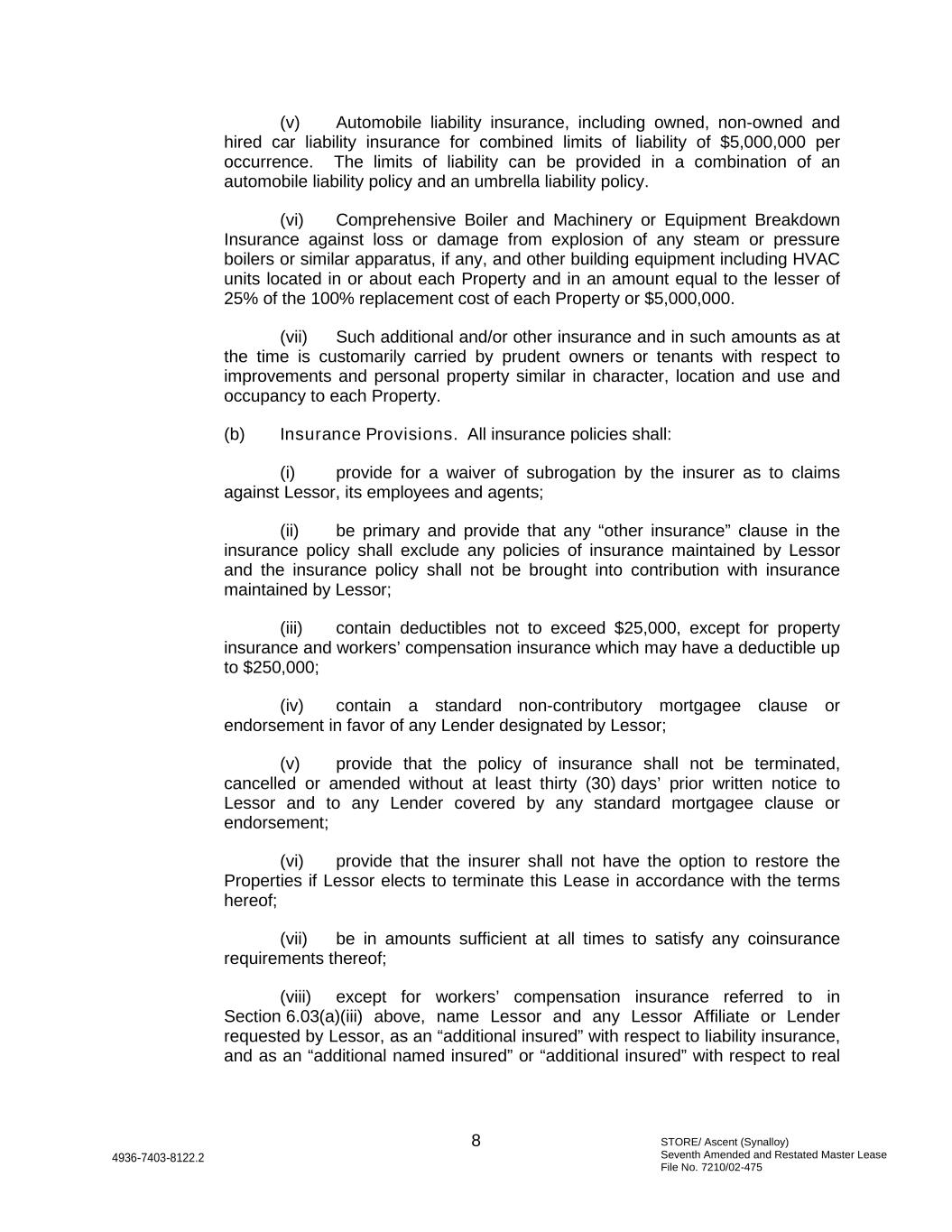 STORE/ Ascent (Synalloy) Seventh Amended and Restated Master Lease File No. 7210/02-475 8 4936-7403-8122.2 (v) Automobile liability insurance, including owned, non-owned and hired car liability insurance for combined limits of liability of $5,000,000 per occurrence. The limits of liability can be provided in a combination of an automobile liability policy and an umbrella liability policy. (vi) Comprehensive Boiler and Machinery or Equipment Breakdown Insurance against loss or damage from explosion of any steam or pressure boilers or similar apparatus, if any, and other building equipment including HVAC units located in or about each Property and in an amount equal to the lesser of 25% of the 100% replacement cost of each Property or $5,000,000. (vii) Such additional and/or other insurance and in such amounts as at the time is customarily carried by prudent owners or tenants with respect to improvements and personal property similar in character, location and use and occupancy to each Property. (b) Insurance Provisions. All insurance policies shall: (i) provide for a waiver of subrogation by the insurer as to claims against Lessor, its employees and agents; (ii) be primary and provide that any “other insurance” clause in the insurance policy shall exclude any policies of insurance maintained by Lessor and the insurance policy shall not be brought into contribution with insurance maintained by Lessor; (iii) contain deductibles not to exceed $25,000, except for property insurance and workers’ compensation insurance which may have a deductible up to $250,000; (iv) contain a standard non-contributory mortgagee clause or endorsement in favor of any Lender designated by Lessor; (v) provide that the policy of insurance shall not be terminated, cancelled or amended without at least thirty (30) days’ prior written notice to Lessor and to any Lender covered by any standard mortgagee clause or endorsement; (vi) provide that the insurer shall not have the option to restore the Properties if Lessor elects to terminate this Lease in accordance with the terms hereof; (vii) be in amounts sufficient at all times to satisfy any coinsurance requirements thereof; (viii) except for workers’ compensation insurance referred to in Section 6.03(a)(iii) above, name Lessor and any Lessor Affiliate or Lender requested by Lessor, as an “additional insured” with respect to liability insurance, and as an “additional named insured” or “additional insured” with respect to real