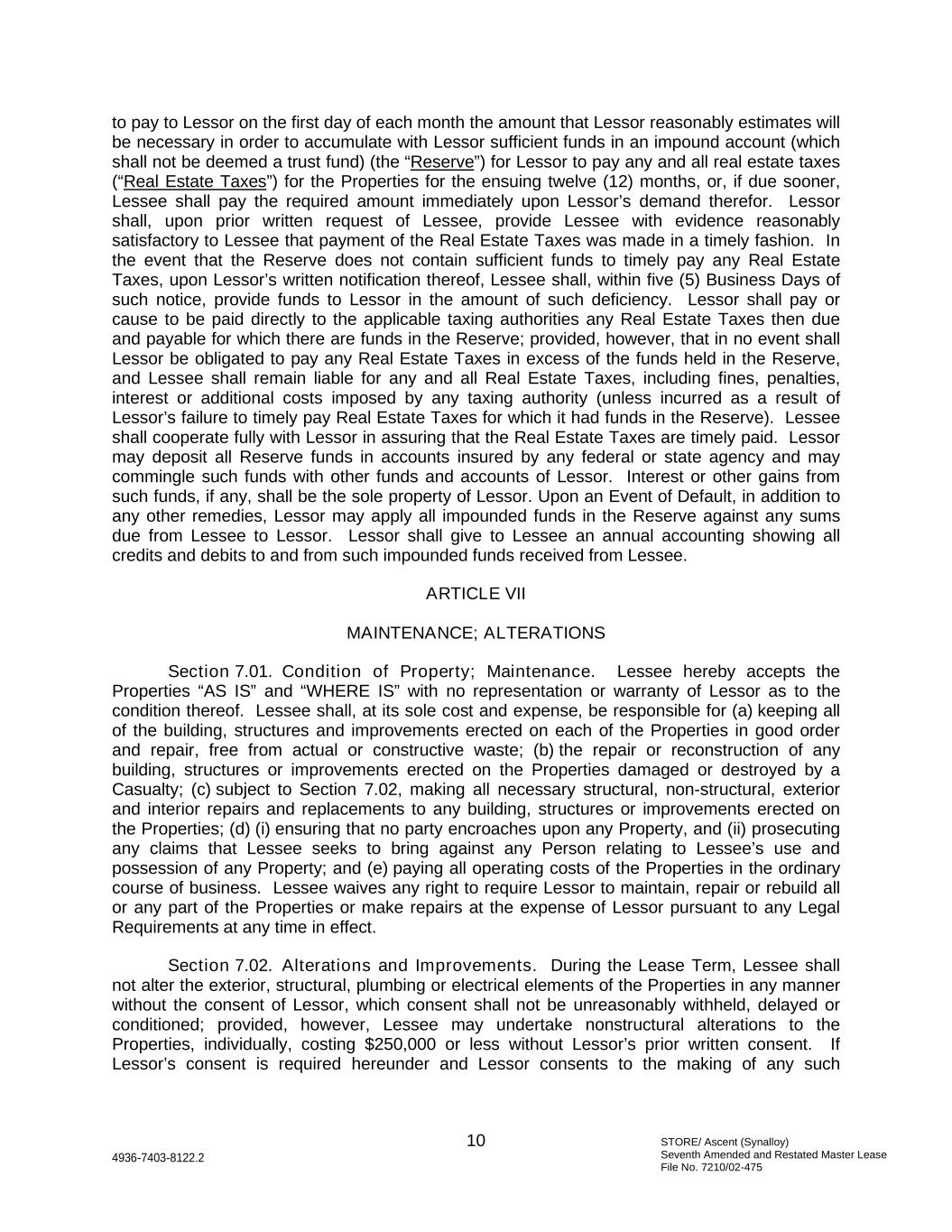 STORE/ Ascent (Synalloy) Seventh Amended and Restated Master Lease File No. 7210/02-475 10 4936-7403-8122.2 to pay to Lessor on the first day of each month the amount that Lessor reasonably estimates will be necessary in order to accumulate with Lessor sufficient funds in an impound account (which shall not be deemed a trust fund) (the “Reserve”) for Lessor to pay any and all real estate taxes (“Real Estate Taxes”) for the Properties for the ensuing twelve (12) months, or, if due sooner, Lessee shall pay the required amount immediately upon Lessor’s demand therefor. Lessor shall, upon prior written request of Lessee, provide Lessee with evidence reasonably satisfactory to Lessee that payment of the Real Estate Taxes was made in a timely fashion. In the event that the Reserve does not contain sufficient funds to timely pay any Real Estate Taxes, upon Lessor’s written notification thereof, Lessee shall, within five (5) Business Days of such notice, provide funds to Lessor in the amount of such deficiency. Lessor shall pay or cause to be paid directly to the applicable taxing authorities any Real Estate Taxes then due and payable for which there are funds in the Reserve; provided, however, that in no event shall Lessor be obligated to pay any Real Estate Taxes in excess of the funds held in the Reserve, and Lessee shall remain liable for any and all Real Estate Taxes, including fines, penalties, interest or additional costs imposed by any taxing authority (unless incurred as a result of Lessor’s failure to timely pay Real Estate Taxes for which it had funds in the Reserve). Lessee shall cooperate fully with Lessor in assuring that the Real Estate Taxes are timely paid. Lessor may deposit all Reserve funds in accounts insured by any federal or state agency and may commingle such funds with other funds and accounts of Lessor. Interest or other gains from such funds, if any, shall be the sole property of Lessor. Upon an Event of Default, in addition to any other remedies, Lessor may apply all impounded funds in the Reserve against any sums due from Lessee to Lessor. Lessor shall give to Lessee an annual accounting showing all credits and debits to and from such impounded funds received from Lessee. ARTICLE VII MAINTENANCE; ALTERATIONS Section 7.01. Condition of Property; Maintenance. Lessee hereby accepts the Properties “AS IS” and “WHERE IS” with no representation or warranty of Lessor as to the condition thereof. Lessee shall, at its sole cost and expense, be responsible for (a) keeping all of the building, structures and improvements erected on each of the Properties in good order and repair, free from actual or constructive waste; (b) the repair or reconstruction of any building, structures or improvements erected on the Properties damaged or destroyed by a Casualty; (c) subject to Section 7.02, making all necessary structural, non-structural, exterior and interior repairs and replacements to any building, structures or improvements erected on the Properties; (d) (i) ensuring that no party encroaches upon any Property, and (ii) prosecuting any claims that Lessee seeks to bring against any Person relating to Lessee’s use and possession of any Property; and (e) paying all operating costs of the Properties in the ordinary course of business. Lessee waives any right to require Lessor to maintain, repair or rebuild all or any part of the Properties or make repairs at the expense of Lessor pursuant to any Legal Requirements at any time in effect. Section 7.02. Alterations and Improvements. During the Lease Term, Lessee shall not alter the exterior, structural, plumbing or electrical elements of the Properties in any manner without the consent of Lessor, which consent shall not be unreasonably withheld, delayed or conditioned; provided, however, Lessee may undertake nonstructural alterations to the Properties, individually, costing $250,000 or less without Lessor’s prior written consent. If Lessor’s consent is required hereunder and Lessor consents to the making of any such