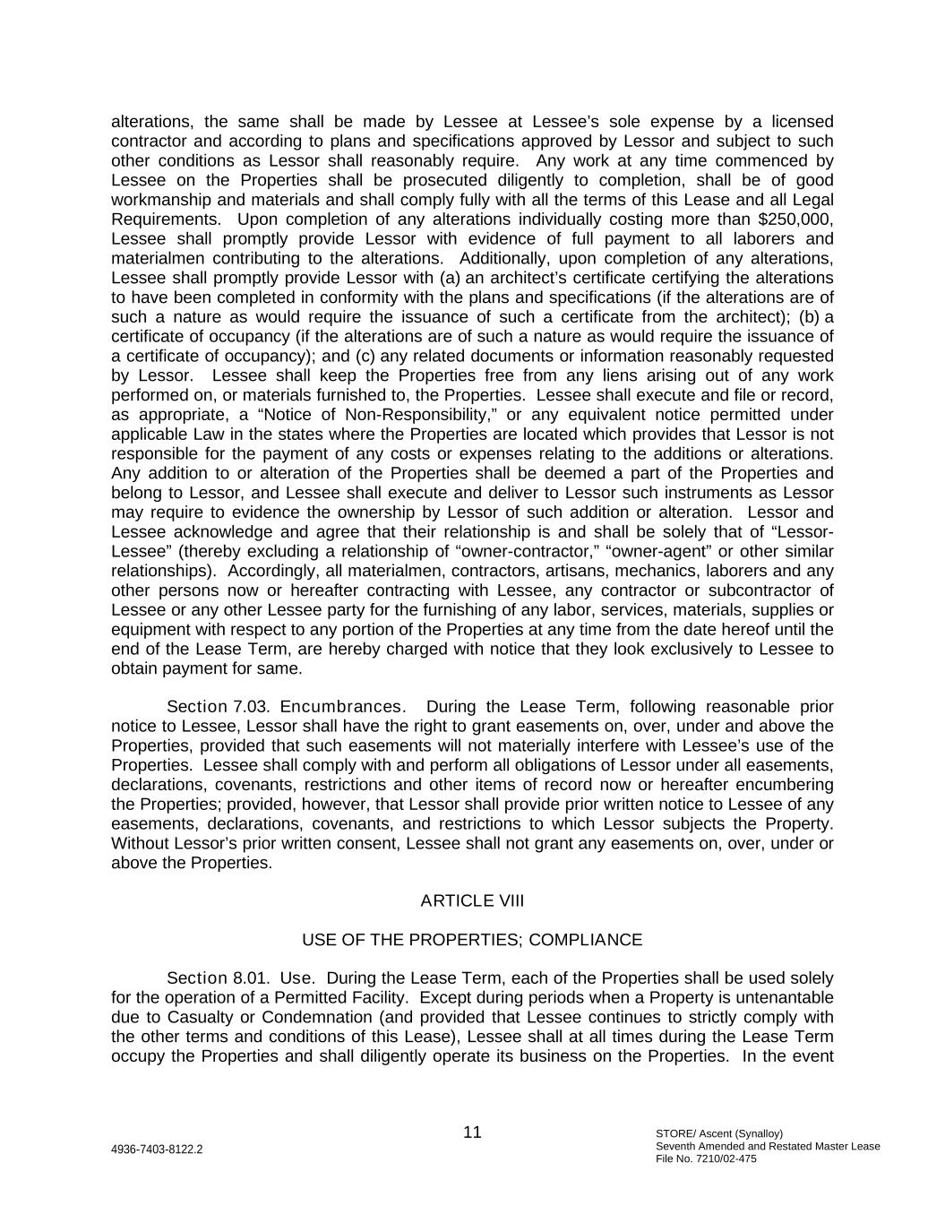 STORE/ Ascent (Synalloy) Seventh Amended and Restated Master Lease File No. 7210/02-475 11 4936-7403-8122.2 alterations, the same shall be made by Lessee at Lessee’s sole expense by a licensed contractor and according to plans and specifications approved by Lessor and subject to such other conditions as Lessor shall reasonably require. Any work at any time commenced by Lessee on the Properties shall be prosecuted diligently to completion, shall be of good workmanship and materials and shall comply fully with all the terms of this Lease and all Legal Requirements. Upon completion of any alterations individually costing more than $250,000, Lessee shall promptly provide Lessor with evidence of full payment to all laborers and materialmen contributing to the alterations. Additionally, upon completion of any alterations, Lessee shall promptly provide Lessor with (a) an architect’s certificate certifying the alterations to have been completed in conformity with the plans and specifications (if the alterations are of such a nature as would require the issuance of such a certificate from the architect); (b) a certificate of occupancy (if the alterations are of such a nature as would require the issuance of a certificate of occupancy); and (c) any related documents or information reasonably requested by Lessor. Lessee shall keep the Properties free from any liens arising out of any work performed on, or materials furnished to, the Properties. Lessee shall execute and file or record, as appropriate, a “Notice of Non-Responsibility,” or any equivalent notice permitted under applicable Law in the states where the Properties are located which provides that Lessor is not responsible for the payment of any costs or expenses relating to the additions or alterations. Any addition to or alteration of the Properties shall be deemed a part of the Properties and belong to Lessor, and Lessee shall execute and deliver to Lessor such instruments as Lessor may require to evidence the ownership by Lessor of such addition or alteration. Lessor and Lessee acknowledge and agree that their relationship is and shall be solely that of “Lessor- Lessee” (thereby excluding a relationship of “owner-contractor,” “owner-agent” or other similar relationships). Accordingly, all materialmen, contractors, artisans, mechanics, laborers and any other persons now or hereafter contracting with Lessee, any contractor or subcontractor of Lessee or any other Lessee party for the furnishing of any labor, services, materials, supplies or equipment with respect to any portion of the Properties at any time from the date hereof until the end of the Lease Term, are hereby charged with notice that they look exclusively to Lessee to obtain payment for same. Section 7.03. Encumbrances. During the Lease Term, following reasonable prior notice to Lessee, Lessor shall have the right to grant easements on, over, under and above the Properties, provided that such easements will not materially interfere with Lessee’s use of the Properties. Lessee shall comply with and perform all obligations of Lessor under all easements, declarations, covenants, restrictions and other items of record now or hereafter encumbering the Properties; provided, however, that Lessor shall provide prior written notice to Lessee of any easements, declarations, covenants, and restrictions to which Lessor subjects the Property. Without Lessor’s prior written consent, Lessee shall not grant any easements on, over, under or above the Properties. ARTICLE VIII USE OF THE PROPERTIES; COMPLIANCE Section 8.01. Use. During the Lease Term, each of the Properties shall be used solely for the operation of a Permitted Facility. Except during periods when a Property is untenantable due to Casualty or Condemnation (and provided that Lessee continues to strictly comply with the other terms and conditions of this Lease), Lessee shall at all times during the Lease Term occupy the Properties and shall diligently operate its business on the Properties. In the event