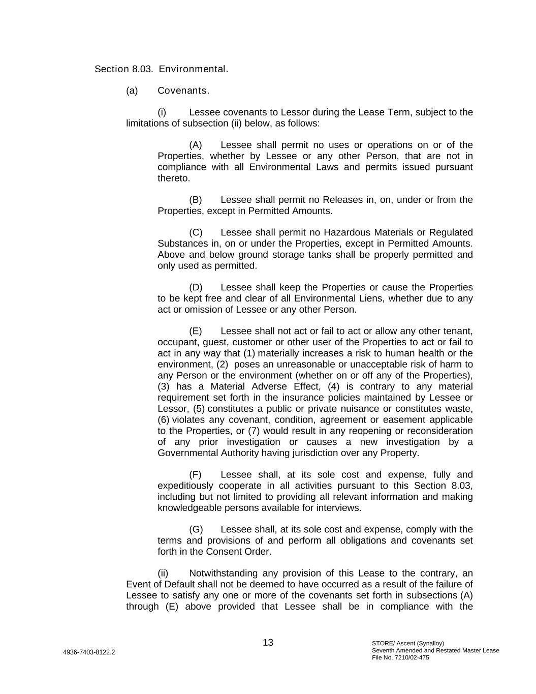 STORE/ Ascent (Synalloy) Seventh Amended and Restated Master Lease File No. 7210/02-475 13 4936-7403-8122.2 Section 8.03. Environmental. (a) Covenants. (i) Lessee covenants to Lessor during the Lease Term, subject to the limitations of subsection (ii) below, as follows: (A) Lessee shall permit no uses or operations on or of the Properties, whether by Lessee or any other Person, that are not in compliance with all Environmental Laws and permits issued pursuant thereto. (B) Lessee shall permit no Releases in, on, under or from the Properties, except in Permitted Amounts. (C) Lessee shall permit no Hazardous Materials or Regulated Substances in, on or under the Properties, except in Permitted Amounts. Above and below ground storage tanks shall be properly permitted and only used as permitted. (D) Lessee shall keep the Properties or cause the Properties to be kept free and clear of all Environmental Liens, whether due to any act or omission of Lessee or any other Person. (E) Lessee shall not act or fail to act or allow any other tenant, occupant, guest, customer or other user of the Properties to act or fail to act in any way that (1) materially increases a risk to human health or the environment, (2) poses an unreasonable or unacceptable risk of harm to any Person or the environment (whether on or off any of the Properties), (3) has a Material Adverse Effect, (4) is contrary to any material requirement set forth in the insurance policies maintained by Lessee or Lessor, (5) constitutes a public or private nuisance or constitutes waste, (6) violates any covenant, condition, agreement or easement applicable to the Properties, or (7) would result in any reopening or reconsideration of any prior investigation or causes a new investigation by a Governmental Authority having jurisdiction over any Property. (F) Lessee shall, at its sole cost and expense, fully and expeditiously cooperate in all activities pursuant to this Section 8.03, including but not limited to providing all relevant information and making knowledgeable persons available for interviews. (G) Lessee shall, at its sole cost and expense, comply with the terms and provisions of and perform all obligations and covenants set forth in the Consent Order. (ii) Notwithstanding any provision of this Lease to the contrary, an Event of Default shall not be deemed to have occurred as a result of the failure of Lessee to satisfy any one or more of the covenants set forth in subsections (A) through (E) above provided that Lessee shall be in compliance with the