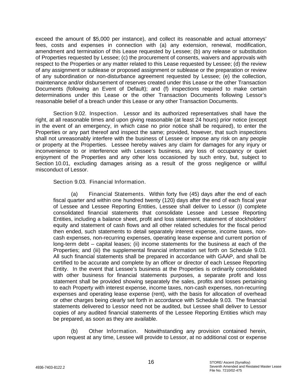 STORE/ Ascent (Synalloy) Seventh Amended and Restated Master Lease File No. 7210/02-475 16 4936-7403-8122.2 exceed the amount of $5,000 per instance), and collect its reasonable and actual attorneys’ fees, costs and expenses in connection with (a) any extension, renewal, modification, amendment and termination of this Lease requested by Lessee; (b) any release or substitution of Properties requested by Lessee; (c) the procurement of consents, waivers and approvals with respect to the Properties or any matter related to this Lease requested by Lessee; (d) the review of any assignment or sublease or proposed assignment or sublease or the preparation or review of any subordination or non-disturbance agreement requested by Lessee; (e) the collection, maintenance and/or disbursement of reserves created under this Lease or the other Transaction Documents (following an Event of Default); and (f) inspections required to make certain determinations under this Lease or the other Transaction Documents following Lessor’s reasonable belief of a breach under this Lease or any other Transaction Documents. Section 9.02. Inspection. Lessor and its authorized representatives shall have the right, at all reasonable times and upon giving reasonable (at least 24 hours) prior notice (except in the event of an emergency, in which case no prior notice shall be required), to enter the Properties or any part thereof and inspect the same; provided, however, that such inspections shall not unreasonably interfere with the business of Lessee or impose any risk on any people or property at the Properties. Lessee hereby waives any claim for damages for any injury or inconvenience to or interference with Lessee’s business, any loss of occupancy or quiet enjoyment of the Properties and any other loss occasioned by such entry, but, subject to Section 10.01, excluding damages arising as a result of the gross negligence or willful misconduct of Lessor. Section 9.03. Financial Information. (a) Financial Statements. Within forty five (45) days after the end of each fiscal quarter and within one hundred twenty (120) days after the end of each fiscal year of Lessee and Lessee Reporting Entities, Lessee shall deliver to Lessor (i) complete consolidated financial statements that consolidate Lessee and Lessee Reporting Entities, including a balance sheet, profit and loss statement, statement of stockholders’ equity and statement of cash flows and all other related schedules for the fiscal period then ended, such statements to detail separately interest expense, income taxes, non- cash expenses, non-recurring expenses, operating lease expense and current portion of long-term debt – capital leases; (ii) income statements for the business at each of the Properties; and (iii) the supplemental financial information set forth on Schedule 9.03. All such financial statements shall be prepared in accordance with GAAP, and shall be certified to be accurate and complete by an officer or director of each Lessee Reporting Entity. In the event that Lessee’s business at the Properties is ordinarily consolidated with other business for financial statements purposes, a separate profit and loss statement shall be provided showing separately the sales, profits and losses pertaining to each Property with interest expense, income taxes, non-cash expenses, non-recurring expenses and operating lease expense (rent), with the basis for allocation of overhead or other charges being clearly set forth in accordance with Schedule 9.03. The financial statements delivered to Lessor need not be audited, but Lessee shall deliver to Lessor copies of any audited financial statements of the Lessee Reporting Entities which may be prepared, as soon as they are available. (b) Other Information. Notwithstanding any provision contained herein, upon request at any time, Lessee will provide to Lessor, at no additional cost or expense