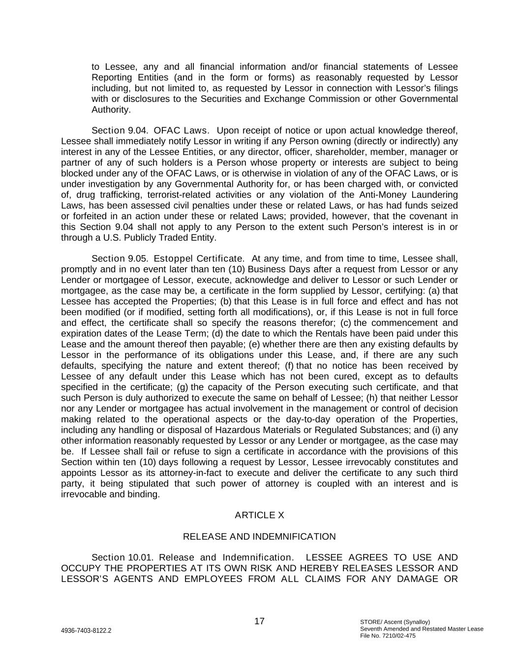STORE/ Ascent (Synalloy) Seventh Amended and Restated Master Lease File No. 7210/02-475 17 4936-7403-8122.2 to Lessee, any and all financial information and/or financial statements of Lessee Reporting Entities (and in the form or forms) as reasonably requested by Lessor including, but not limited to, as requested by Lessor in connection with Lessor’s filings with or disclosures to the Securities and Exchange Commission or other Governmental Authority. Section 9.04. OFAC Laws. Upon receipt of notice or upon actual knowledge thereof, Lessee shall immediately notify Lessor in writing if any Person owning (directly or indirectly) any interest in any of the Lessee Entities, or any director, officer, shareholder, member, manager or partner of any of such holders is a Person whose property or interests are subject to being blocked under any of the OFAC Laws, or is otherwise in violation of any of the OFAC Laws, or is under investigation by any Governmental Authority for, or has been charged with, or convicted of, drug trafficking, terrorist-related activities or any violation of the Anti-Money Laundering Laws, has been assessed civil penalties under these or related Laws, or has had funds seized or forfeited in an action under these or related Laws; provided, however, that the covenant in this Section 9.04 shall not apply to any Person to the extent such Person’s interest is in or through a U.S. Publicly Traded Entity. Section 9.05. Estoppel Certificate. At any time, and from time to time, Lessee shall, promptly and in no event later than ten (10) Business Days after a request from Lessor or any Lender or mortgagee of Lessor, execute, acknowledge and deliver to Lessor or such Lender or mortgagee, as the case may be, a certificate in the form supplied by Lessor, certifying: (a) that Lessee has accepted the Properties; (b) that this Lease is in full force and effect and has not been modified (or if modified, setting forth all modifications), or, if this Lease is not in full force and effect, the certificate shall so specify the reasons therefor; (c) the commencement and expiration dates of the Lease Term; (d) the date to which the Rentals have been paid under this Lease and the amount thereof then payable; (e) whether there are then any existing defaults by Lessor in the performance of its obligations under this Lease, and, if there are any such defaults, specifying the nature and extent thereof; (f) that no notice has been received by Lessee of any default under this Lease which has not been cured, except as to defaults specified in the certificate; (g) the capacity of the Person executing such certificate, and that such Person is duly authorized to execute the same on behalf of Lessee; (h) that neither Lessor nor any Lender or mortgagee has actual involvement in the management or control of decision making related to the operational aspects or the day-to-day operation of the Properties, including any handling or disposal of Hazardous Materials or Regulated Substances; and (i) any other information reasonably requested by Lessor or any Lender or mortgagee, as the case may be. If Lessee shall fail or refuse to sign a certificate in accordance with the provisions of this Section within ten (10) days following a request by Lessor, Lessee irrevocably constitutes and appoints Lessor as its attorney-in-fact to execute and deliver the certificate to any such third party, it being stipulated that such power of attorney is coupled with an interest and is irrevocable and binding. ARTICLE X RELEASE AND INDEMNIFICATION Section 10.01. Release and Indemnification. LESSEE AGREES TO USE AND OCCUPY THE PROPERTIES AT ITS OWN RISK AND HEREBY RELEASES LESSOR AND LESSOR’S AGENTS AND EMPLOYEES FROM ALL CLAIMS FOR ANY DAMAGE OR