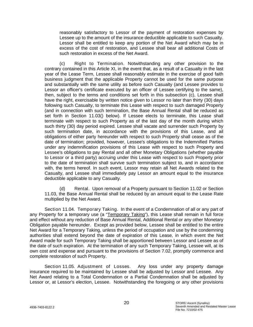 STORE/ Ascent (Synalloy) Seventh Amended and Restated Master Lease File No. 7210/02-475 20 4936-7403-8122.2 reasonably satisfactory to Lessor of the payment of restoration expenses by Lessee up to the amount of the insurance deductible applicable to such Casualty. Lessor shall be entitled to keep any portion of the Net Award which may be in excess of the cost of restoration, and Lessee shall bear all additional Costs of such restoration in excess of the Net Award. (c) Right to Termination. Notwithstanding any other provision to the contrary contained in this Article XI, in the event that, as a result of a Casualty in the last year of the Lease Term, Lessee shall reasonably estimate in the exercise of good faith business judgment that the applicable Property cannot be used for the same purpose and substantially with the same utility as before such Casualty (and Lessee provides to Lessor an officer's certificate executed by an officer of Lessee certifying to the same), then, subject to the terms and conditions set forth in this subsection (c), Lessee shall have the right, exercisable by written notice given to Lessor no later than thirty (30) days following such Casualty, to terminate this Lease with respect to such damaged Property (and in connection with such termination, the Base Annual Rental shall be reduced as set forth in Section 11.03() below). If Lessee elects to terminate, this Lease shall terminate with respect to such Property as of the last day of the month during which such thirty (30) day period expired. Lessee shall vacate and surrender such Property by such termination date, in accordance with the provisions of this Lease, and ail obligations of either party hereunder with respect to such Property shall cease as of the date of termination; provided, however, Lessee's obligations to the Indemnified Parties under any indemnification provisions of this Lease with respect to such Property and Lessee's obligations to pay Rental and all other Monetary Obligations (whether payable to Lessor or a third party) accruing under this Lease with respect to such Property prior to the date of termination shall survive such termination subject to, and in accordance with, the terms hereof. In such event, Lessor may retain all Net Awards related to the Casualty, and Lessee shall immediately pay Lessor an amount equal to the insurance deductible applicable to any Casualty. (d) Rental. Upon removal of a Property pursuant to Section 11.02 or Section 11.03, the Base Annual Rental shall be reduced by an amount equal to the Lease Rate multiplied by the Net Award. Section 11.04. Temporary Taking. In the event of a Condemnation of all or any part of any Property for a temporary use (a “Temporary Taking”), this Lease shall remain in full force and effect without any reduction of Base Annual Rental, Additional Rental or any other Monetary Obligation payable hereunder. Except as provided below, Lessee shall be entitled to the entire Net Award for a Temporary Taking, unless the period of occupation and use by the condemning authorities shall extend beyond the date of expiration of this Lease, in which event the Net Award made for such Temporary Taking shall be apportioned between Lessor and Lessee as of the date of such expiration. At the termination of any such Temporary Taking, Lessee will, at its own cost and expense and pursuant to the provisions of Section 7.02, promptly commence and complete restoration of such Property. Section 11.05. Adjustment of Losses. Any loss under any property damage insurance required to be maintained by Lessee shall be adjusted by Lessor and Lessee. Any Net Award relating to a Total Condemnation or a Partial Condemnation shall be adjusted by Lessor or, at Lessor’s election, Lessee. Notwithstanding the foregoing or any other provisions
