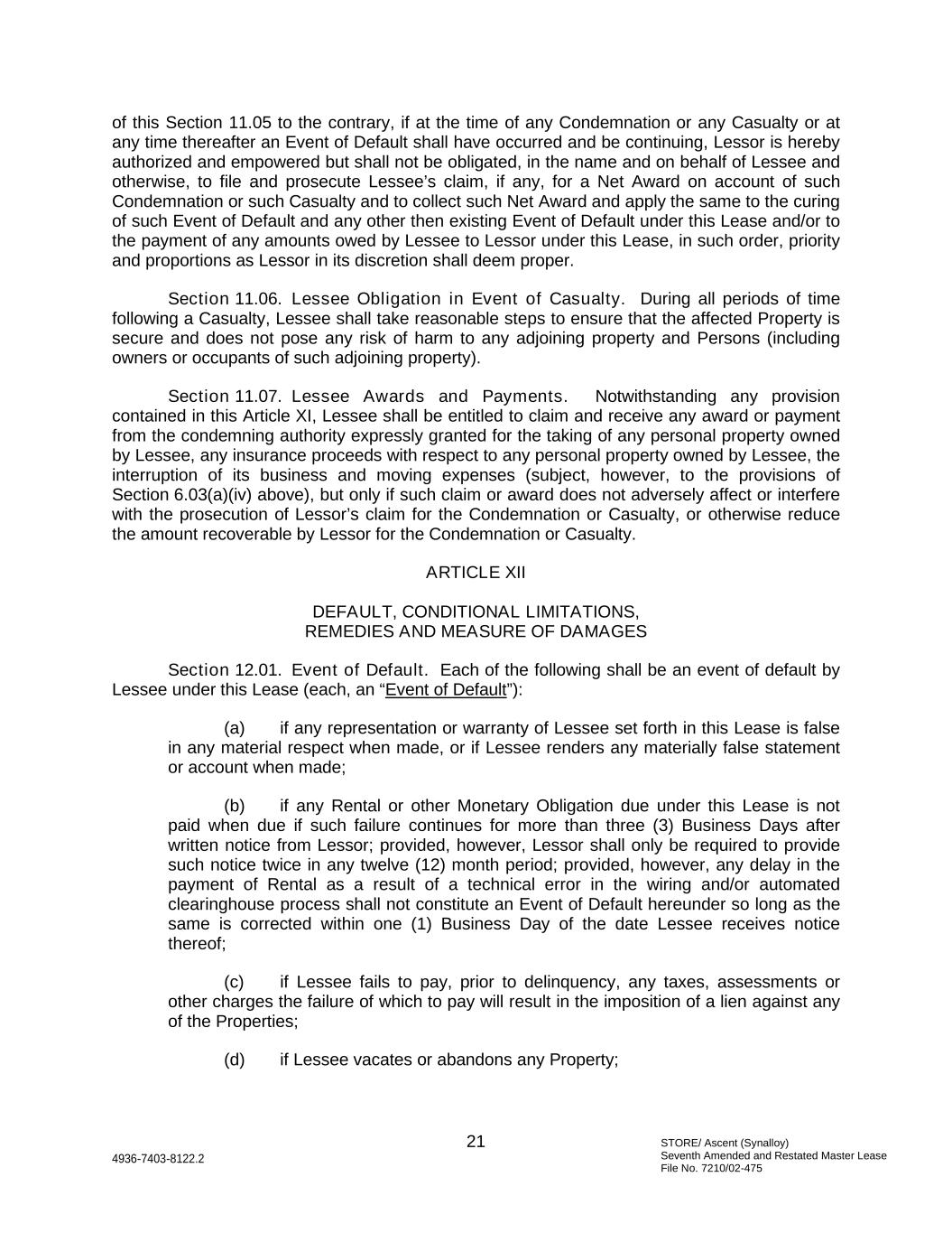 STORE/ Ascent (Synalloy) Seventh Amended and Restated Master Lease File No. 7210/02-475 21 4936-7403-8122.2 of this Section 11.05 to the contrary, if at the time of any Condemnation or any Casualty or at any time thereafter an Event of Default shall have occurred and be continuing, Lessor is hereby authorized and empowered but shall not be obligated, in the name and on behalf of Lessee and otherwise, to file and prosecute Lessee’s claim, if any, for a Net Award on account of such Condemnation or such Casualty and to collect such Net Award and apply the same to the curing of such Event of Default and any other then existing Event of Default under this Lease and/or to the payment of any amounts owed by Lessee to Lessor under this Lease, in such order, priority and proportions as Lessor in its discretion shall deem proper. Section 11.06. Lessee Obligation in Event of Casualty. During all periods of time following a Casualty, Lessee shall take reasonable steps to ensure that the affected Property is secure and does not pose any risk of harm to any adjoining property and Persons (including owners or occupants of such adjoining property). Section 11.07. Lessee Awards and Payments. Notwithstanding any provision contained in this Article XI, Lessee shall be entitled to claim and receive any award or payment from the condemning authority expressly granted for the taking of any personal property owned by Lessee, any insurance proceeds with respect to any personal property owned by Lessee, the interruption of its business and moving expenses (subject, however, to the provisions of Section 6.03(a)(iv) above), but only if such claim or award does not adversely affect or interfere with the prosecution of Lessor’s claim for the Condemnation or Casualty, or otherwise reduce the amount recoverable by Lessor for the Condemnation or Casualty. ARTICLE XII DEFAULT, CONDITIONAL LIMITATIONS, REMEDIES AND MEASURE OF DAMAGES Section 12.01. Event of Default. Each of the following shall be an event of default by Lessee under this Lease (each, an “Event of Default”): (a) if any representation or warranty of Lessee set forth in this Lease is false in any material respect when made, or if Lessee renders any materially false statement or account when made; (b) if any Rental or other Monetary Obligation due under this Lease is not paid when due if such failure continues for more than three (3) Business Days after written notice from Lessor; provided, however, Lessor shall only be required to provide such notice twice in any twelve (12) month period; provided, however, any delay in the payment of Rental as a result of a technical error in the wiring and/or automated clearinghouse process shall not constitute an Event of Default hereunder so long as the same is corrected within one (1) Business Day of the date Lessee receives notice thereof; (c) if Lessee fails to pay, prior to delinquency, any taxes, assessments or other charges the failure of which to pay will result in the imposition of a lien against any of the Properties; (d) if Lessee vacates or abandons any Property;