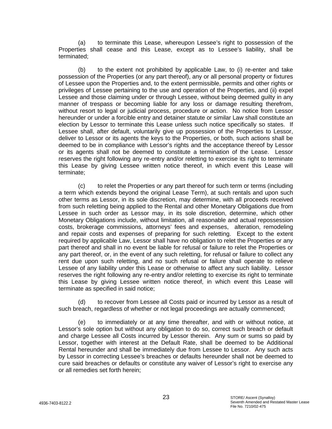 STORE/ Ascent (Synalloy) Seventh Amended and Restated Master Lease File No. 7210/02-475 23 4936-7403-8122.2 (a) to terminate this Lease, whereupon Lessee’s right to possession of the Properties shall cease and this Lease, except as to Lessee’s liability, shall be terminated; (b) to the extent not prohibited by applicable Law, to (i) re-enter and take possession of the Properties (or any part thereof), any or all personal property or fixtures of Lessee upon the Properties and, to the extent permissible, permits and other rights or privileges of Lessee pertaining to the use and operation of the Properties, and (ii) expel Lessee and those claiming under or through Lessee, without being deemed guilty in any manner of trespass or becoming liable for any loss or damage resulting therefrom, without resort to legal or judicial process, procedure or action. No notice from Lessor hereunder or under a forcible entry and detainer statute or similar Law shall constitute an election by Lessor to terminate this Lease unless such notice specifically so states. If Lessee shall, after default, voluntarily give up possession of the Properties to Lessor, deliver to Lessor or its agents the keys to the Properties, or both, such actions shall be deemed to be in compliance with Lessor’s rights and the acceptance thereof by Lessor or its agents shall not be deemed to constitute a termination of the Lease. Lessor reserves the right following any re-entry and/or reletting to exercise its right to terminate this Lease by giving Lessee written notice thereof, in which event this Lease will terminate; (c) to relet the Properties or any part thereof for such term or terms (including a term which extends beyond the original Lease Term), at such rentals and upon such other terms as Lessor, in its sole discretion, may determine, with all proceeds received from such reletting being applied to the Rental and other Monetary Obligations due from Lessee in such order as Lessor may, in its sole discretion, determine, which other Monetary Obligations include, without limitation, all reasonable and actual repossession costs, brokerage commissions, attorneys’ fees and expenses, alteration, remodeling and repair costs and expenses of preparing for such reletting. Except to the extent required by applicable Law, Lessor shall have no obligation to relet the Properties or any part thereof and shall in no event be liable for refusal or failure to relet the Properties or any part thereof, or, in the event of any such reletting, for refusal or failure to collect any rent due upon such reletting, and no such refusal or failure shall operate to relieve Lessee of any liability under this Lease or otherwise to affect any such liability. Lessor reserves the right following any re-entry and/or reletting to exercise its right to terminate this Lease by giving Lessee written notice thereof, in which event this Lease will terminate as specified in said notice; (d) to recover from Lessee all Costs paid or incurred by Lessor as a result of such breach, regardless of whether or not legal proceedings are actually commenced; (e) to immediately or at any time thereafter, and with or without notice, at Lessor’s sole option but without any obligation to do so, correct such breach or default and charge Lessee all Costs incurred by Lessor therein. Any sum or sums so paid by Lessor, together with interest at the Default Rate, shall be deemed to be Additional Rental hereunder and shall be immediately due from Lessee to Lessor. Any such acts by Lessor in correcting Lessee’s breaches or defaults hereunder shall not be deemed to cure said breaches or defaults or constitute any waiver of Lessor’s right to exercise any or all remedies set forth herein;
