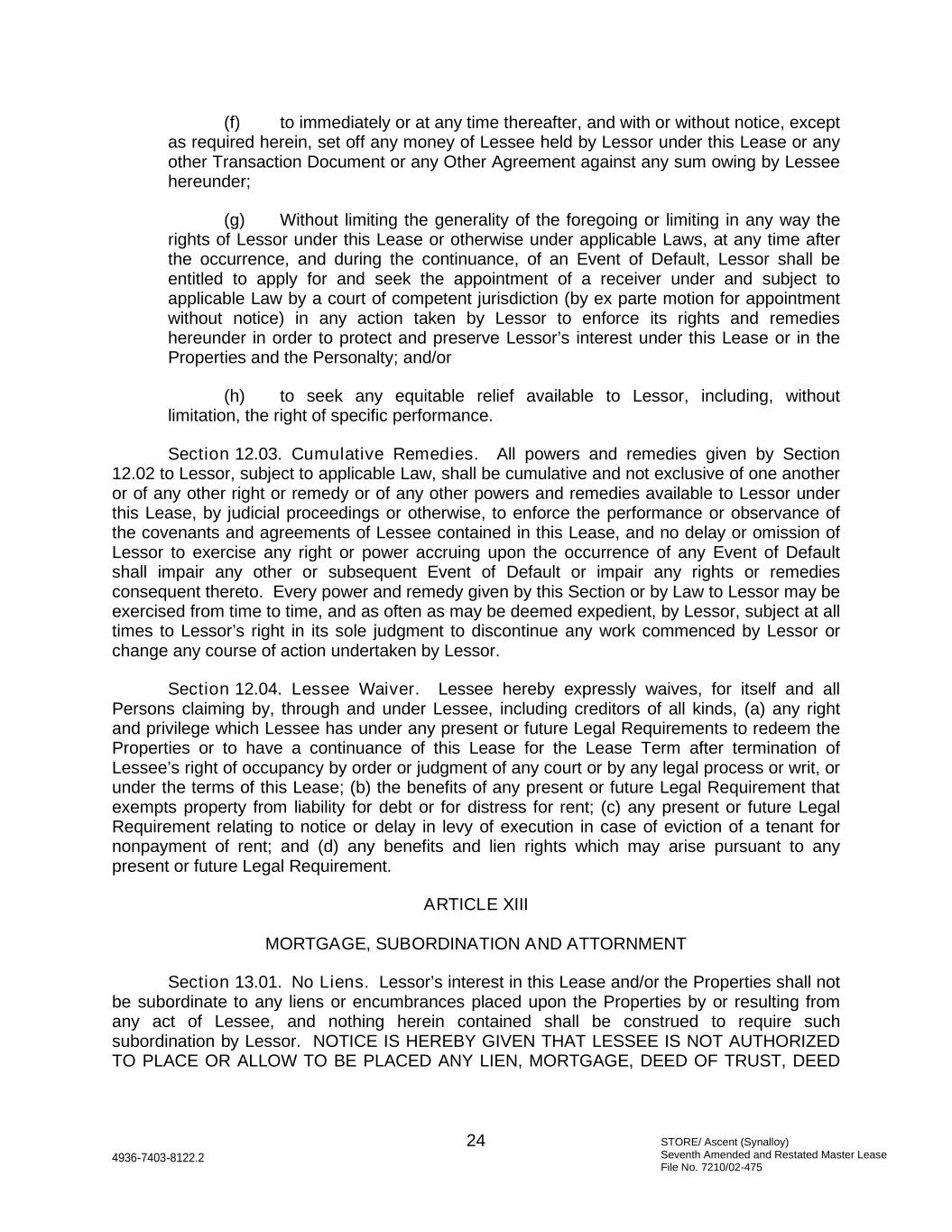 STORE/ Ascent (Synalloy) Seventh Amended and Restated Master Lease File No. 7210/02-475 24 4936-7403-8122.2 (f) to immediately or at any time thereafter, and with or without notice, except as required herein, set off any money of Lessee held by Lessor under this Lease or any other Transaction Document or any Other Agreement against any sum owing by Lessee hereunder; (g) Without limiting the generality of the foregoing or limiting in any way the rights of Lessor under this Lease or otherwise under applicable Laws, at any time after the occurrence, and during the continuance, of an Event of Default, Lessor shall be entitled to apply for and seek the appointment of a receiver under and subject to applicable Law by a court of competent jurisdiction (by ex parte motion for appointment without notice) in any action taken by Lessor to enforce its rights and remedies hereunder in order to protect and preserve Lessor’s interest under this Lease or in the Properties and the Personalty; and/or (h) to seek any equitable relief available to Lessor, including, without limitation, the right of specific performance. Section 12.03. Cumulative Remedies. All powers and remedies given by Section 12.02 to Lessor, subject to applicable Law, shall be cumulative and not exclusive of one another or of any other right or remedy or of any other powers and remedies available to Lessor under this Lease, by judicial proceedings or otherwise, to enforce the performance or observance of the covenants and agreements of Lessee contained in this Lease, and no delay or omission of Lessor to exercise any right or power accruing upon the occurrence of any Event of Default shall impair any other or subsequent Event of Default or impair any rights or remedies consequent thereto. Every power and remedy given by this Section or by Law to Lessor may be exercised from time to time, and as often as may be deemed expedient, by Lessor, subject at all times to Lessor’s right in its sole judgment to discontinue any work commenced by Lessor or change any course of action undertaken by Lessor. Section 12.04. Lessee Waiver. Lessee hereby expressly waives, for itself and all Persons claiming by, through and under Lessee, including creditors of all kinds, (a) any right and privilege which Lessee has under any present or future Legal Requirements to redeem the Properties or to have a continuance of this Lease for the Lease Term after termination of Lessee’s right of occupancy by order or judgment of any court or by any legal process or writ, or under the terms of this Lease; (b) the benefits of any present or future Legal Requirement that exempts property from liability for debt or for distress for rent; (c) any present or future Legal Requirement relating to notice or delay in levy of execution in case of eviction of a tenant for nonpayment of rent; and (d) any benefits and lien rights which may arise pursuant to any present or future Legal Requirement. ARTICLE XIII MORTGAGE, SUBORDINATION AND ATTORNMENT Section 13.01. No Liens. Lessor’s interest in this Lease and/or the Properties shall not be subordinate to any liens or encumbrances placed upon the Properties by or resulting from any act of Lessee, and nothing herein contained shall be construed to require such subordination by Lessor. NOTICE IS HEREBY GIVEN THAT LESSEE IS NOT AUTHORIZED TO PLACE OR ALLOW TO BE PLACED ANY LIEN, MORTGAGE, DEED OF TRUST, DEED