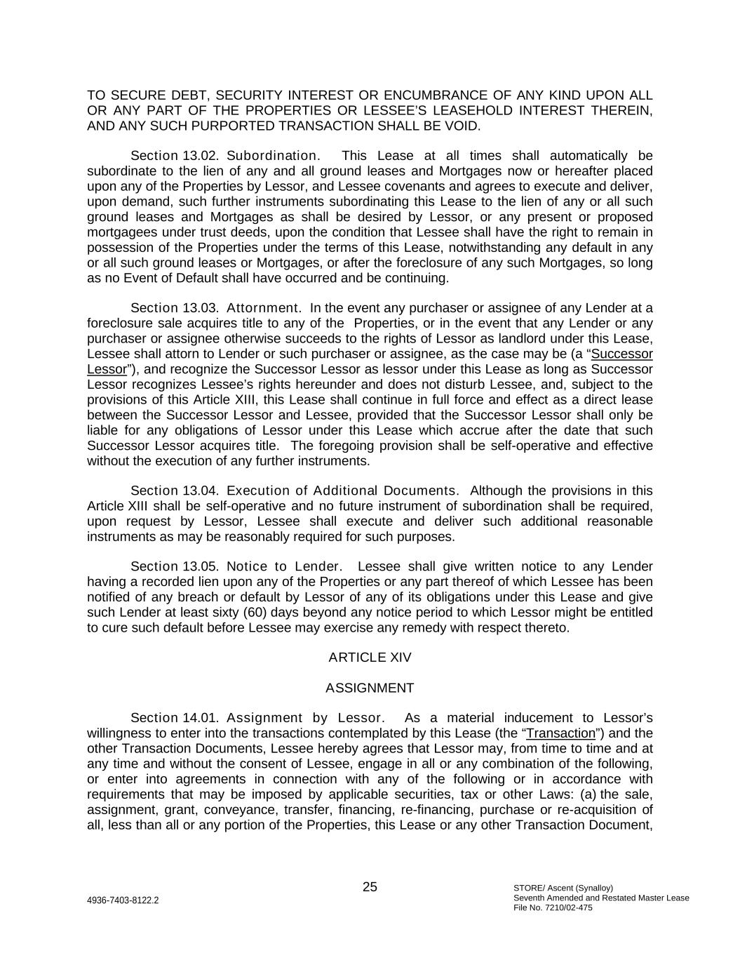 STORE/ Ascent (Synalloy) Seventh Amended and Restated Master Lease File No. 7210/02-475 25 4936-7403-8122.2 TO SECURE DEBT, SECURITY INTEREST OR ENCUMBRANCE OF ANY KIND UPON ALL OR ANY PART OF THE PROPERTIES OR LESSEE’S LEASEHOLD INTEREST THEREIN, AND ANY SUCH PURPORTED TRANSACTION SHALL BE VOID. Section 13.02. Subordination. This Lease at all times shall automatically be subordinate to the lien of any and all ground leases and Mortgages now or hereafter placed upon any of the Properties by Lessor, and Lessee covenants and agrees to execute and deliver, upon demand, such further instruments subordinating this Lease to the lien of any or all such ground leases and Mortgages as shall be desired by Lessor, or any present or proposed mortgagees under trust deeds, upon the condition that Lessee shall have the right to remain in possession of the Properties under the terms of this Lease, notwithstanding any default in any or all such ground leases or Mortgages, or after the foreclosure of any such Mortgages, so long as no Event of Default shall have occurred and be continuing. Section 13.03. Attornment. In the event any purchaser or assignee of any Lender at a foreclosure sale acquires title to any of the Properties, or in the event that any Lender or any purchaser or assignee otherwise succeeds to the rights of Lessor as landlord under this Lease, Lessee shall attorn to Lender or such purchaser or assignee, as the case may be (a “Successor Lessor”), and recognize the Successor Lessor as lessor under this Lease as long as Successor Lessor recognizes Lessee’s rights hereunder and does not disturb Lessee, and, subject to the provisions of this Article XIII, this Lease shall continue in full force and effect as a direct lease between the Successor Lessor and Lessee, provided that the Successor Lessor shall only be liable for any obligations of Lessor under this Lease which accrue after the date that such Successor Lessor acquires title. The foregoing provision shall be self-operative and effective without the execution of any further instruments. Section 13.04. Execution of Additional Documents. Although the provisions in this Article XIII shall be self-operative and no future instrument of subordination shall be required, upon request by Lessor, Lessee shall execute and deliver such additional reasonable instruments as may be reasonably required for such purposes. Section 13.05. Notice to Lender. Lessee shall give written notice to any Lender having a recorded lien upon any of the Properties or any part thereof of which Lessee has been notified of any breach or default by Lessor of any of its obligations under this Lease and give such Lender at least sixty (60) days beyond any notice period to which Lessor might be entitled to cure such default before Lessee may exercise any remedy with respect thereto. ARTICLE XIV ASSIGNMENT Section 14.01. Assignment by Lessor. As a material inducement to Lessor’s willingness to enter into the transactions contemplated by this Lease (the “Transaction”) and the other Transaction Documents, Lessee hereby agrees that Lessor may, from time to time and at any time and without the consent of Lessee, engage in all or any combination of the following, or enter into agreements in connection with any of the following or in accordance with requirements that may be imposed by applicable securities, tax or other Laws: (a) the sale, assignment, grant, conveyance, transfer, financing, re-financing, purchase or re-acquisition of all, less than all or any portion of the Properties, this Lease or any other Transaction Document,