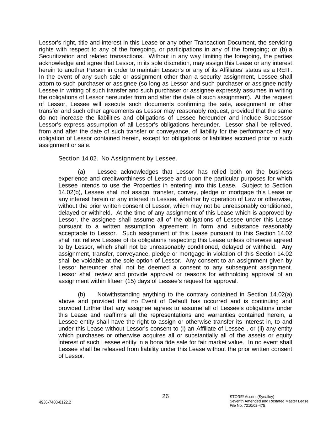 STORE/ Ascent (Synalloy) Seventh Amended and Restated Master Lease File No. 7210/02-475 26 4936-7403-8122.2 Lessor’s right, title and interest in this Lease or any other Transaction Document, the servicing rights with respect to any of the foregoing, or participations in any of the foregoing; or (b) a Securitization and related transactions. Without in any way limiting the foregoing, the parties acknowledge and agree that Lessor, in its sole discretion, may assign this Lease or any interest herein to another Person in order to maintain Lessor’s or any of its Affiliates’ status as a REIT. In the event of any such sale or assignment other than a security assignment, Lessee shall attorn to such purchaser or assignee (so long as Lessor and such purchaser or assignee notify Lessee in writing of such transfer and such purchaser or assignee expressly assumes in writing the obligations of Lessor hereunder from and after the date of such assignment). At the request of Lessor, Lessee will execute such documents confirming the sale, assignment or other transfer and such other agreements as Lessor may reasonably request, provided that the same do not increase the liabilities and obligations of Lessee hereunder and include Successor Lessor’s express assumption of all Lessor’s obligations hereunder. Lessor shall be relieved, from and after the date of such transfer or conveyance, of liability for the performance of any obligation of Lessor contained herein, except for obligations or liabilities accrued prior to such assignment or sale. Section 14.02. No Assignment by Lessee. (a) Lessee acknowledges that Lessor has relied both on the business experience and creditworthiness of Lessee and upon the particular purposes for which Lessee intends to use the Properties in entering into this Lease. Subject to Section 14.02(b), Lessee shall not assign, transfer, convey, pledge or mortgage this Lease or any interest herein or any interest in Lessee, whether by operation of Law or otherwise, without the prior written consent of Lessor, which may not be unreasonably conditioned, delayed or withheld. At the time of any assignment of this Lease which is approved by Lessor, the assignee shall assume all of the obligations of Lessee under this Lease pursuant to a written assumption agreement in form and substance reasonably acceptable to Lessor. Such assignment of this Lease pursuant to this Section 14.02 shall not relieve Lessee of its obligations respecting this Lease unless otherwise agreed to by Lessor, which shall not be unreasonably conditioned, delayed or withheld. Any assignment, transfer, conveyance, pledge or mortgage in violation of this Section 14.02 shall be voidable at the sole option of Lessor. Any consent to an assignment given by Lessor hereunder shall not be deemed a consent to any subsequent assignment. Lessor shall review and provide approval or reasons for withholding approval of an assignment within fifteen (15) days of Lessee’s request for approval. (b) Notwithstanding anything to the contrary contained in Section 14.02(a) above and provided that no Event of Default has occurred and is continuing and provided further that any assignee agrees to assume all of Lessee's obligations under this Lease and reaffirms all the representations and warranties contained herein, a Lessee entity shall have the right to assign or otherwise transfer its interest in, to and under this Lease without Lessor's consent to (i) an Affiliate of Lessee , or (ii) any entity which purchases or otherwise acquires all or substantially all of the assets or equity interest of such Lessee entity in a bona fide sale for fair market value. In no event shall Lessee shall be released from liability under this Lease without the prior written consent of Lessor.