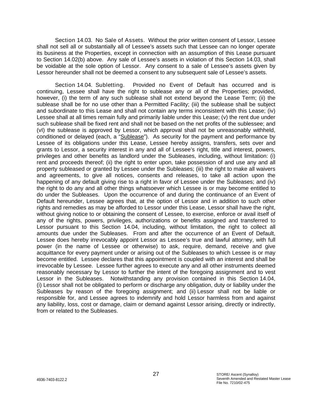STORE/ Ascent (Synalloy) Seventh Amended and Restated Master Lease File No. 7210/02-475 27 4936-7403-8122.2 Section 14.03. No Sale of Assets. Without the prior written consent of Lessor, Lessee shall not sell all or substantially all of Lessee’s assets such that Lessee can no longer operate its business at the Properties, except in connection with an assumption of this Lease pursuant to Section 14.02(b) above. Any sale of Lessee’s assets in violation of this Section 14.03, shall be voidable at the sole option of Lessor. Any consent to a sale of Lessee’s assets given by Lessor hereunder shall not be deemed a consent to any subsequent sale of Lessee’s assets. Section 14.04. Subletting. Provided no Event of Default has occurred and is continuing, Lessee shall have the right to sublease any or all of the Properties; provided, however, (i) the term of any such sublease shall not extend beyond the Lease Term; (ii) the sublease shall be for no use other than a Permitted Facility; (iii) the sublease shall be subject and subordinate to this Lease and shall not contain any terms inconsistent with this Lease; (iv) Lessee shall at all times remain fully and primarily liable under this Lease; (v) the rent due under such sublease shall be fixed rent and shall not be based on the net profits of the sublessee; and (vI) the sublease is approved by Lessor, which approval shall not be unreasonably withheld, conditioned or delayed (each, a “Sublease”). As security for the payment and performance by Lessee of its obligations under this Lease, Lessee hereby assigns, transfers, sets over and grants to Lessor, a security interest in any and all of Lessee’s right, title and interest, powers, privileges and other benefits as landlord under the Subleases, including, without limitation: (i) rent and proceeds thereof; (ii) the right to enter upon, take possession of and use any and all property subleased or granted by Lessee under the Subleases; (iii) the right to make all waivers and agreements, to give all notices, consents and releases, to take all action upon the happening of any default giving rise to a right in favor of Lessee under the Subleases; and (iv) the right to do any and all other things whatsoever which Lessee is or may become entitled to do under the Subleases. Upon the occurrence of and during the continuance of an Event of Default hereunder, Lessee agrees that, at the option of Lessor and in addition to such other rights and remedies as may be afforded to Lessor under this Lease, Lessor shall have the right, without giving notice to or obtaining the consent of Lessee, to exercise, enforce or avail itself of any of the rights, powers, privileges, authorizations or benefits assigned and transferred to Lessor pursuant to this Section 14.04, including, without limitation, the right to collect all amounts due under the Subleases. From and after the occurrence of an Event of Default, Lessee does hereby irrevocably appoint Lessor as Lessee’s true and lawful attorney, with full power (in the name of Lessee or otherwise) to ask, require, demand, receive and give acquittance for every payment under or arising out of the Subleases to which Lessee is or may become entitled. Lessee declares that this appointment is coupled with an interest and shall be irrevocable by Lessee. Lessee further agrees to execute any and all other instruments deemed reasonably necessary by Lessor to further the intent of the foregoing assignment and to vest Lessor in the Subleases. Notwithstanding any provision contained in this Section 14.04, (i) Lessor shall not be obligated to perform or discharge any obligation, duty or liability under the Subleases by reason of the foregoing assignment; and (ii) Lessor shall not be liable or responsible for, and Lessee agrees to indemnify and hold Lessor harmless from and against any liability, loss, cost or damage, claim or demand against Lessor arising, directly or indirectly, from or related to the Subleases.