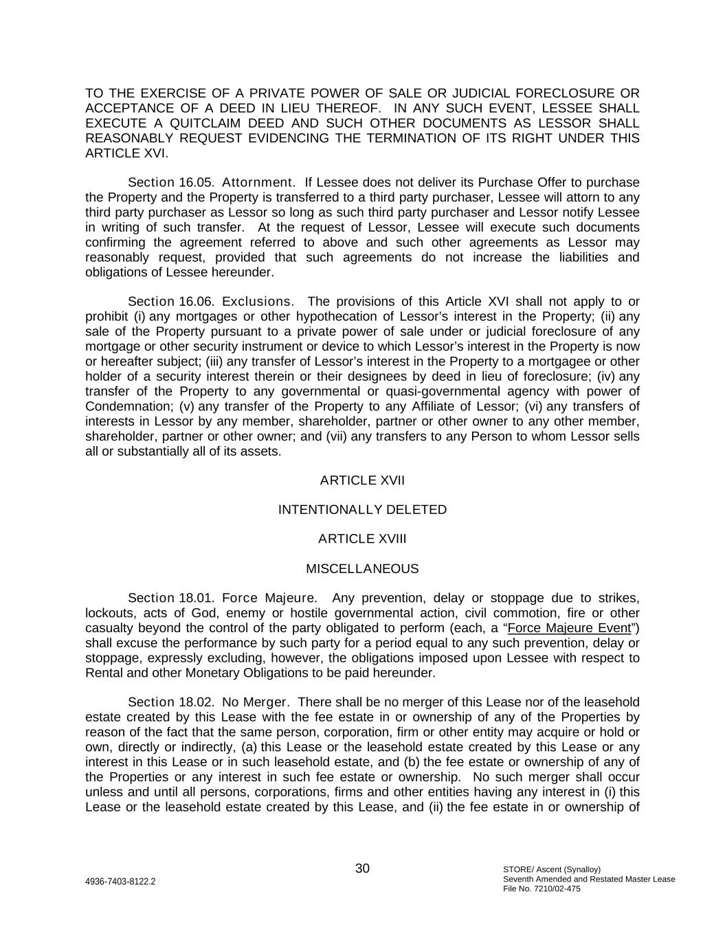 STORE/ Ascent (Synalloy) Seventh Amended and Restated Master Lease File No. 7210/02-475 30 4936-7403-8122.2 TO THE EXERCISE OF A PRIVATE POWER OF SALE OR JUDICIAL FORECLOSURE OR ACCEPTANCE OF A DEED IN LIEU THEREOF. IN ANY SUCH EVENT, LESSEE SHALL EXECUTE A QUITCLAIM DEED AND SUCH OTHER DOCUMENTS AS LESSOR SHALL REASONABLY REQUEST EVIDENCING THE TERMINATION OF ITS RIGHT UNDER THIS ARTICLE XVI. Section 16.05. Attornment. If Lessee does not deliver its Purchase Offer to purchase the Property and the Property is transferred to a third party purchaser, Lessee will attorn to any third party purchaser as Lessor so long as such third party purchaser and Lessor notify Lessee in writing of such transfer. At the request of Lessor, Lessee will execute such documents confirming the agreement referred to above and such other agreements as Lessor may reasonably request, provided that such agreements do not increase the liabilities and obligations of Lessee hereunder. Section 16.06. Exclusions. The provisions of this Article XVI shall not apply to or prohibit (i) any mortgages or other hypothecation of Lessor’s interest in the Property; (ii) any sale of the Property pursuant to a private power of sale under or judicial foreclosure of any mortgage or other security instrument or device to which Lessor’s interest in the Property is now or hereafter subject; (iii) any transfer of Lessor’s interest in the Property to a mortgagee or other holder of a security interest therein or their designees by deed in lieu of foreclosure; (iv) any transfer of the Property to any governmental or quasi-governmental agency with power of Condemnation; (v) any transfer of the Property to any Affiliate of Lessor; (vi) any transfers of interests in Lessor by any member, shareholder, partner or other owner to any other member, shareholder, partner or other owner; and (vii) any transfers to any Person to whom Lessor sells all or substantially all of its assets. ARTICLE XVII INTENTIONALLY DELETED ARTICLE XVIII MISCELLANEOUS Section 18.01. Force Majeure. Any prevention, delay or stoppage due to strikes, lockouts, acts of God, enemy or hostile governmental action, civil commotion, fire or other casualty beyond the control of the party obligated to perform (each, a “Force Majeure Event”) shall excuse the performance by such party for a period equal to any such prevention, delay or stoppage, expressly excluding, however, the obligations imposed upon Lessee with respect to Rental and other Monetary Obligations to be paid hereunder. Section 18.02. No Merger. There shall be no merger of this Lease nor of the leasehold estate created by this Lease with the fee estate in or ownership of any of the Properties by reason of the fact that the same person, corporation, firm or other entity may acquire or hold or own, directly or indirectly, (a) this Lease or the leasehold estate created by this Lease or any interest in this Lease or in such leasehold estate, and (b) the fee estate or ownership of any of the Properties or any interest in such fee estate or ownership. No such merger shall occur unless and until all persons, corporations, firms and other entities having any interest in (i) this Lease or the leasehold estate created by this Lease, and (ii) the fee estate in or ownership of