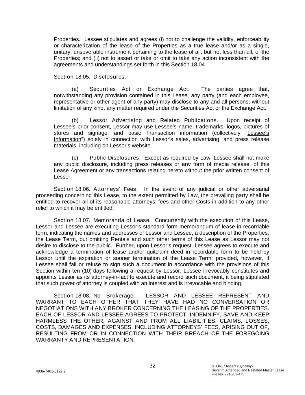 STORE/ Ascent (Synalloy) Seventh Amended and Restated Master Lease File No. 7210/02-475 32 4936-7403-8122.2 Properties. Lessee stipulates and agrees (i) not to challenge the validity, enforceability or characterization of the lease of the Properties as a true lease and/or as a single, unitary, unseverable instrument pertaining to the lease of all, but not less than all, of the Properties; and (ii) not to assert or take or omit to take any action inconsistent with the agreements and understandings set forth in this Section 18.04. Section 18.05. Disclosures. (a) Securities Act or Exchange Act. The parties agree that, notwithstanding any provision contained in this Lease, any party (and each employee, representative or other agent of any party) may disclose to any and all persons, without limitation of any kind, any matter required under the Securities Act or the Exchange Act. (b) Lessor Advertising and Related Publications. Upon receipt of Lessee’s prior consent, Lessor may use Lessee’s name, trademarks, logos, pictures of stores and signage, and basic Transaction information (collectively “Lessee’s Information”) solely in connection with Lessor’s sales, advertising, and press release materials, including on Lessor’s website. (c) Public Disclosures. Except as required by Law, Lessee shall not make any public disclosure, including press releases or any form of media release, of this Lease Agreement or any transactions relating hereto without the prior written consent of Lessor. Section 18.06. Attorneys’ Fees. In the event of any judicial or other adversarial proceeding concerning this Lease, to the extent permitted by Law, the prevailing party shall be entitled to recover all of its reasonable attorneys’ fees and other Costs in addition to any other relief to which it may be entitled. Section 18.07. Memoranda of Lease. Concurrently with the execution of this Lease, Lessor and Lessee are executing Lessor’s standard form memorandum of lease in recordable form, indicating the names and addresses of Lessor and Lessee, a description of the Properties, the Lease Term, but omitting Rentals and such other terms of this Lease as Lessor may not desire to disclose to the public. Further, upon Lessor’s request, Lessee agrees to execute and acknowledge a termination of lease and/or quitclaim deed in recordable form to be held by Lessor until the expiration or sooner termination of the Lease Term; provided, however, if Lessee shall fail or refuse to sign such a document in accordance with the provisions of this Section within ten (10) days following a request by Lessor, Lessee irrevocably constitutes and appoints Lessor as its attorney-in-fact to execute and record such document, it being stipulated that such power of attorney is coupled with an interest and is irrevocable and binding. Section 18.08. No Brokerage. LESSOR AND LESSEE REPRESENT AND WARRANT TO EACH OTHER THAT THEY HAVE HAD NO CONVERSATION OR NEGOTIATIONS WITH ANY BROKER CONCERNING THE LEASING OF THE PROPERTIES. EACH OF LESSOR AND LESSEE AGREES TO PROTECT, INDEMNIFY, SAVE AND KEEP HARMLESS THE OTHER, AGAINST AND FROM ALL LIABILITIES, CLAIMS, LOSSES, COSTS, DAMAGES AND EXPENSES, INCLUDING ATTORNEYS’ FEES, ARISING OUT OF, RESULTING FROM OR IN CONNECTION WITH THEIR BREACH OF THE FOREGOING WARRANTY AND REPRESENTATION.