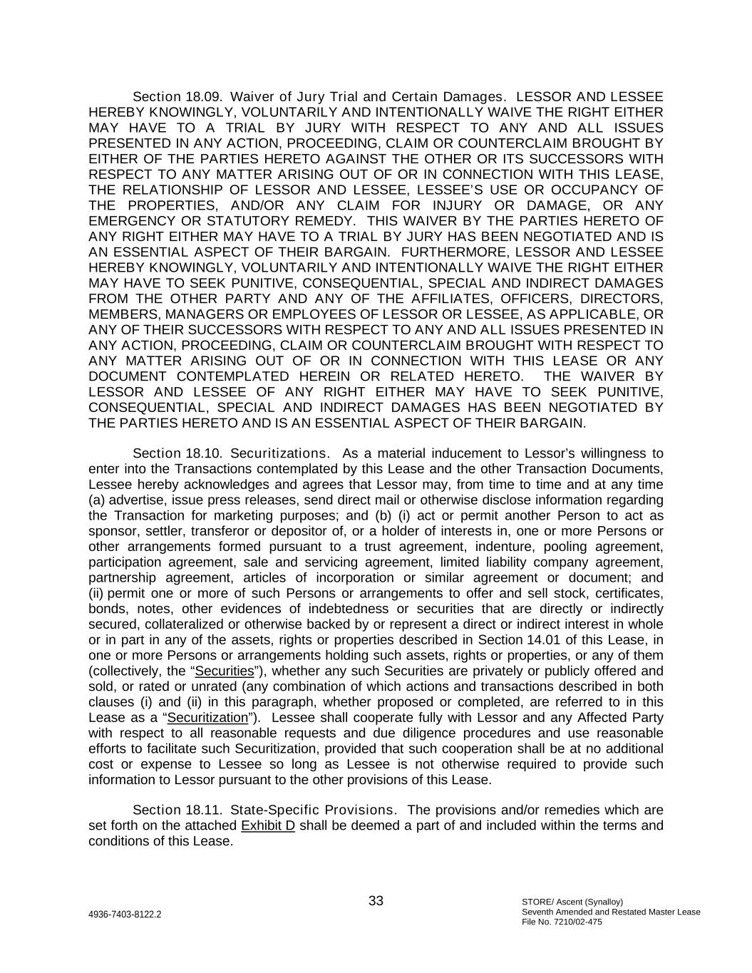 STORE/ Ascent (Synalloy) Seventh Amended and Restated Master Lease File No. 7210/02-475 33 4936-7403-8122.2 Section 18.09. Waiver of Jury Trial and Certain Damages. LESSOR AND LESSEE HEREBY KNOWINGLY, VOLUNTARILY AND INTENTIONALLY WAIVE THE RIGHT EITHER MAY HAVE TO A TRIAL BY JURY WITH RESPECT TO ANY AND ALL ISSUES PRESENTED IN ANY ACTION, PROCEEDING, CLAIM OR COUNTERCLAIM BROUGHT BY EITHER OF THE PARTIES HERETO AGAINST THE OTHER OR ITS SUCCESSORS WITH RESPECT TO ANY MATTER ARISING OUT OF OR IN CONNECTION WITH THIS LEASE, THE RELATIONSHIP OF LESSOR AND LESSEE, LESSEE’S USE OR OCCUPANCY OF THE PROPERTIES, AND/OR ANY CLAIM FOR INJURY OR DAMAGE, OR ANY EMERGENCY OR STATUTORY REMEDY. THIS WAIVER BY THE PARTIES HERETO OF ANY RIGHT EITHER MAY HAVE TO A TRIAL BY JURY HAS BEEN NEGOTIATED AND IS AN ESSENTIAL ASPECT OF THEIR BARGAIN. FURTHERMORE, LESSOR AND LESSEE HEREBY KNOWINGLY, VOLUNTARILY AND INTENTIONALLY WAIVE THE RIGHT EITHER MAY HAVE TO SEEK PUNITIVE, CONSEQUENTIAL, SPECIAL AND INDIRECT DAMAGES FROM THE OTHER PARTY AND ANY OF THE AFFILIATES, OFFICERS, DIRECTORS, MEMBERS, MANAGERS OR EMPLOYEES OF LESSOR OR LESSEE, AS APPLICABLE, OR ANY OF THEIR SUCCESSORS WITH RESPECT TO ANY AND ALL ISSUES PRESENTED IN ANY ACTION, PROCEEDING, CLAIM OR COUNTERCLAIM BROUGHT WITH RESPECT TO ANY MATTER ARISING OUT OF OR IN CONNECTION WITH THIS LEASE OR ANY DOCUMENT CONTEMPLATED HEREIN OR RELATED HERETO. THE WAIVER BY LESSOR AND LESSEE OF ANY RIGHT EITHER MAY HAVE TO SEEK PUNITIVE, CONSEQUENTIAL, SPECIAL AND INDIRECT DAMAGES HAS BEEN NEGOTIATED BY THE PARTIES HERETO AND IS AN ESSENTIAL ASPECT OF THEIR BARGAIN. Section 18.10. Securitizations. As a material inducement to Lessor’s willingness to enter into the Transactions contemplated by this Lease and the other Transaction Documents, Lessee hereby acknowledges and agrees that Lessor may, from time to time and at any time (a) advertise, issue press releases, send direct mail or otherwise disclose information regarding the Transaction for marketing purposes; and (b) (i) act or permit another Person to act as sponsor, settler, transferor or depositor of, or a holder of interests in, one or more Persons or other arrangements formed pursuant to a trust agreement, indenture, pooling agreement, participation agreement, sale and servicing agreement, limited liability company agreement, partnership agreement, articles of incorporation or similar agreement or document; and (ii) permit one or more of such Persons or arrangements to offer and sell stock, certificates, bonds, notes, other evidences of indebtedness or securities that are directly or indirectly secured, collateralized or otherwise backed by or represent a direct or indirect interest in whole or in part in any of the assets, rights or properties described in Section 14.01 of this Lease, in one or more Persons or arrangements holding such assets, rights or properties, or any of them (collectively, the “Securities”), whether any such Securities are privately or publicly offered and sold, or rated or unrated (any combination of which actions and transactions described in both clauses (i) and (ii) in this paragraph, whether proposed or completed, are referred to in this Lease as a “Securitization”). Lessee shall cooperate fully with Lessor and any Affected Party with respect to all reasonable requests and due diligence procedures and use reasonable efforts to facilitate such Securitization, provided that such cooperation shall be at no additional cost or expense to Lessee so long as Lessee is not otherwise required to provide such information to Lessor pursuant to the other provisions of this Lease. Section 18.11. State-Specific Provisions. The provisions and/or remedies which are set forth on the attached Exhibit D shall be deemed a part of and included within the terms and conditions of this Lease.