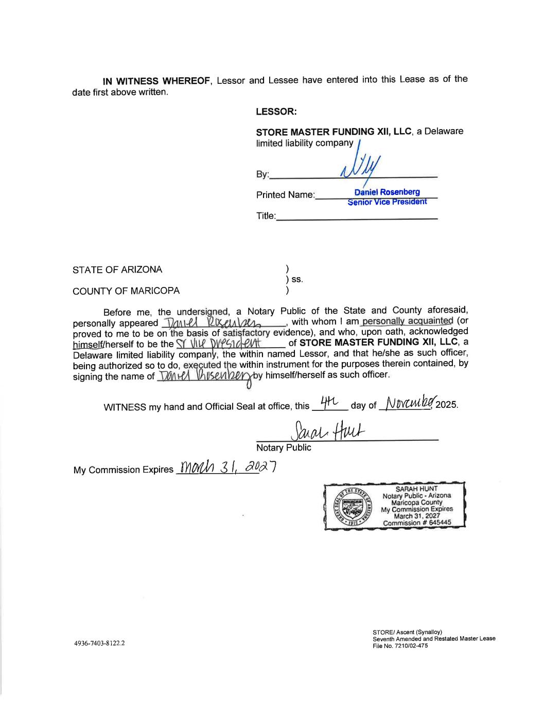 IN WITNESS WHEREOF, Lessor and Lessee have entered into this Lease as of the date first above written. LESSOR: STORE MASTER FUNDING XII, LLC, a Delaware limited liability company Printed Name: Daniel Rosenberg Senior Vice President Title: STATE OF ARIZONA ) ) ss. COUNTY OF MARICOPA ) Before me, the undersigned, a Notary Public of the State and County aforesaid, personally appeared Vanla Yi eller, , with whom | am personally acquainted (or proved to me to be on the basis of satisfactory evidence), and who, upon oath, acknowledged himself/herself to be the CY \e DVPS1¢ of STORE MASTER FUNDING XII, LLC, a Delaware limited liability company, the within named Lessor, and that he/she as such officer, being authorized so to do, executed the within instrument for the purposes therein contained, by signing the name of Vl y himself/herself as such officer. WITNESS my hand and Official Seal at office, this Ht L day of Novel 22008. Sool Notary Public My Commission Expires Moth 3 [, BOR) SARAH HUNT Notary Public - Arizona Maricopa County My Commission Expires March 31, 2027 Commission # 645445 STORE/ Ascent (Synalloy) 4936-7403-8122. 2 Seventh Amended and Restated Master Lease File No. 7210/02-475
