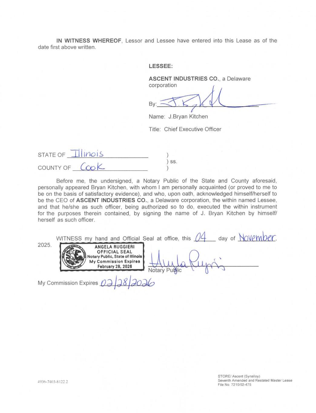 IN WITNESS WHEREOF, Lessor and Lessee have entered into this Lease as of the date first above written. LESSEE: ASCENT INDUSTRIES CO., a Delaware corporation By: asl _—— ra Name: J.Bryan Kitchen Title: Chief Executive Officer STATE OF __LIlINoiS ) ) ss. COUNTY OF _ Cooke ) Before me, the undersigned, a Notary Public of the State and County aforesaid, personally appeared Bryan Kitchen, with whom | am personally acquainted (or proved to me to be on the basis of satisfactory evidence), and who, upon oath, acknowledged himself/herself to be the CEO of ASCENT INDUSTRIES CO., a Delaware corporation, the within named Lessee, and that he/she as such officer, being authorized so to do, executed the within instrument for the purposes therein contained, by signing the name of J. Bryan Kitchen by himself/ herself as such officer. WITNESS my hand and Official Seal at office, this 04 day of November. 2025. ANGELA RUGGIERI OFFICIAL SEAL Notary Public, State of Illinois My Commission Expires February 28, 2026 Notary Puljjic My Commission Expires 0398/2026 STORE/ Ascent (Synalloy) 4936-7403-8 122.2 Seventh Amended and Restated Master Lease File No, 7210/02-475