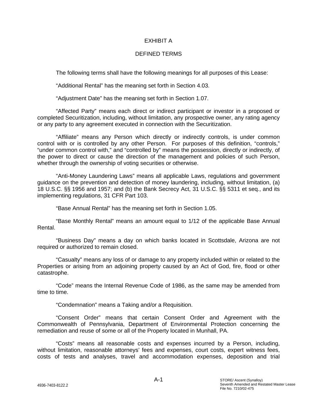 STORE/ Ascent (Synalloy) Seventh Amended and Restated Master Lease File No. 7210/02-475 A-1 4936-7403-8122.2 EXHIBIT A DEFINED TERMS The following terms shall have the following meanings for all purposes of this Lease: “Additional Rental” has the meaning set forth in Section 4.03. “Adjustment Date” has the meaning set forth in Section 1.07. “Affected Party” means each direct or indirect participant or investor in a proposed or completed Securitization, including, without limitation, any prospective owner, any rating agency or any party to any agreement executed in connection with the Securitization. “Affiliate” means any Person which directly or indirectly controls, is under common control with or is controlled by any other Person. For purposes of this definition, “controls,” “under common control with,” and “controlled by” means the possession, directly or indirectly, of the power to direct or cause the direction of the management and policies of such Person, whether through the ownership of voting securities or otherwise. “Anti-Money Laundering Laws” means all applicable Laws, regulations and government guidance on the prevention and detection of money laundering, including, without limitation, (a) 18 U.S.C. §§ 1956 and 1957; and (b) the Bank Secrecy Act, 31 U.S.C. §§ 5311 et seq., and its implementing regulations, 31 CFR Part 103. “Base Annual Rental” has the meaning set forth in Section 1.05. “Base Monthly Rental” means an amount equal to 1/12 of the applicable Base Annual Rental. “Business Day” means a day on which banks located in Scottsdale, Arizona are not required or authorized to remain closed. “Casualty” means any loss of or damage to any property included within or related to the Properties or arising from an adjoining property caused by an Act of God, fire, flood or other catastrophe. “Code” means the Internal Revenue Code of 1986, as the same may be amended from time to time. “Condemnation” means a Taking and/or a Requisition. “Consent Order” means that certain Consent Order and Agreement with the Commonwealth of Pennsylvania, Department of Environmental Protection concerning the remediation and reuse of some or all of the Property located in Munhall, PA. “Costs” means all reasonable costs and expenses incurred by a Person, including, without limitation, reasonable attorneys’ fees and expenses, court costs, expert witness fees, costs of tests and analyses, travel and accommodation expenses, deposition and trial