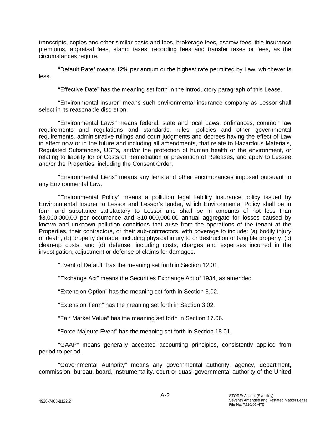 STORE/ Ascent (Synalloy) Seventh Amended and Restated Master Lease File No. 7210/02-475 A-2 4936-7403-8122.2 transcripts, copies and other similar costs and fees, brokerage fees, escrow fees, title insurance premiums, appraisal fees, stamp taxes, recording fees and transfer taxes or fees, as the circumstances require. “Default Rate” means 12% per annum or the highest rate permitted by Law, whichever is less. “Effective Date” has the meaning set forth in the introductory paragraph of this Lease. “Environmental Insurer” means such environmental insurance company as Lessor shall select in its reasonable discretion. “Environmental Laws” means federal, state and local Laws, ordinances, common law requirements and regulations and standards, rules, policies and other governmental requirements, administrative rulings and court judgments and decrees having the effect of Law in effect now or in the future and including all amendments, that relate to Hazardous Materials, Regulated Substances, USTs, and/or the protection of human health or the environment, or relating to liability for or Costs of Remediation or prevention of Releases, and apply to Lessee and/or the Properties, including the Consent Order. “Environmental Liens” means any liens and other encumbrances imposed pursuant to any Environmental Law. “Environmental Policy” means a pollution legal liability insurance policy issued by Environmental Insurer to Lessor and Lessor’s lender, which Environmental Policy shall be in form and substance satisfactory to Lessor and shall be in amounts of not less than $3,000,000.00 per occurrence and $10,000,000.00 annual aggregate for losses caused by known and unknown pollution conditions that arise from the operations of the tenant at the Properties, their contractors, or their sub-contractors, with coverage to include: (a) bodily injury or death, (b) property damage, including physical injury to or destruction of tangible property, (c) clean-up costs, and (d) defense, including costs, charges and expenses incurred in the investigation, adjustment or defense of claims for damages. “Event of Default” has the meaning set forth in Section 12.01. “Exchange Act” means the Securities Exchange Act of 1934, as amended. “Extension Option” has the meaning set forth in Section 3.02. “Extension Term” has the meaning set forth in Section 3.02. “Fair Market Value” has the meaning set forth in Section 17.06. “Force Majeure Event” has the meaning set forth in Section 18.01. “GAAP” means generally accepted accounting principles, consistently applied from period to period. “Governmental Authority” means any governmental authority, agency, department, commission, bureau, board, instrumentality, court or quasi-governmental authority of the United