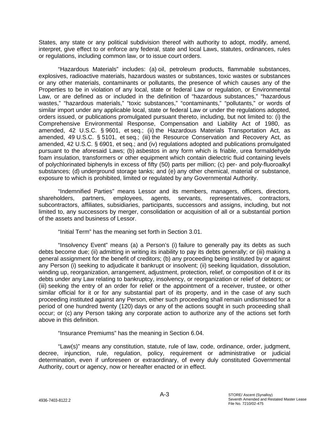 STORE/ Ascent (Synalloy) Seventh Amended and Restated Master Lease File No. 7210/02-475 A-3 4936-7403-8122.2 States, any state or any political subdivision thereof with authority to adopt, modify, amend, interpret, give effect to or enforce any federal, state and local Laws, statutes, ordinances, rules or regulations, including common law, or to issue court orders. “Hazardous Materials” includes: (a) oil, petroleum products, flammable substances, explosives, radioactive materials, hazardous wastes or substances, toxic wastes or substances or any other materials, contaminants or pollutants, the presence of which causes any of the Properties to be in violation of any local, state or federal Law or regulation, or Environmental Law, or are defined as or included in the definition of “hazardous substances,” “hazardous wastes,” “hazardous materials,” “toxic substances,” “contaminants,” “pollutants,” or words of similar import under any applicable local, state or federal Law or under the regulations adopted, orders issued, or publications promulgated pursuant thereto, including, but not limited to: (i) the Comprehensive Environmental Response, Compensation and Liability Act of 1980, as amended, 42 U.S.C. § 9601, et seq.; (ii) the Hazardous Materials Transportation Act, as amended, 49 U.S.C. § 5101, et seq.; (iii) the Resource Conservation and Recovery Act, as amended, 42 U.S.C. § 6901, et seq.; and (iv) regulations adopted and publications promulgated pursuant to the aforesaid Laws; (b) asbestos in any form which is friable, urea formaldehyde foam insulation, transformers or other equipment which contain dielectric fluid containing levels of polychlorinated biphenyls in excess of fifty (50) parts per million; (c) per- and poly-fluoroalkyl substances; (d) underground storage tanks; and (e) any other chemical, material or substance, exposure to which is prohibited, limited or regulated by any Governmental Authority. “Indemnified Parties” means Lessor and its members, managers, officers, directors, shareholders, partners, employees, agents, servants, representatives, contractors, subcontractors, affiliates, subsidiaries, participants, successors and assigns, including, but not limited to, any successors by merger, consolidation or acquisition of all or a substantial portion of the assets and business of Lessor. “Initial Term” has the meaning set forth in Section 3.01. “Insolvency Event” means (a) a Person’s (i) failure to generally pay its debts as such debts become due; (ii) admitting in writing its inability to pay its debts generally; or (iii) making a general assignment for the benefit of creditors; (b) any proceeding being instituted by or against any Person (i) seeking to adjudicate it bankrupt or insolvent; (ii) seeking liquidation, dissolution, winding up, reorganization, arrangement, adjustment, protection, relief, or composition of it or its debts under any Law relating to bankruptcy, insolvency, or reorganization or relief of debtors; or (iii) seeking the entry of an order for relief or the appointment of a receiver, trustee, or other similar official for it or for any substantial part of its property, and in the case of any such proceeding instituted against any Person, either such proceeding shall remain undismissed for a period of one hundred twenty (120) days or any of the actions sought in such proceeding shall occur; or (c) any Person taking any corporate action to authorize any of the actions set forth above in this definition. “Insurance Premiums” has the meaning in Section 6.04. “Law(s)” means any constitution, statute, rule of law, code, ordinance, order, judgment, decree, injunction, rule, regulation, policy, requirement or administrative or judicial determination, even if unforeseen or extraordinary, of every duly constituted Governmental Authority, court or agency, now or hereafter enacted or in effect.