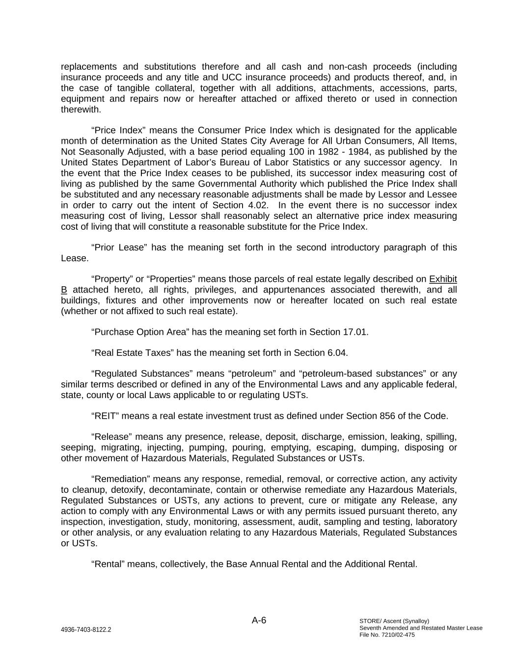 STORE/ Ascent (Synalloy) Seventh Amended and Restated Master Lease File No. 7210/02-475 A-6 4936-7403-8122.2 replacements and substitutions therefore and all cash and non-cash proceeds (including insurance proceeds and any title and UCC insurance proceeds) and products thereof, and, in the case of tangible collateral, together with all additions, attachments, accessions, parts, equipment and repairs now or hereafter attached or affixed thereto or used in connection therewith. “Price Index” means the Consumer Price Index which is designated for the applicable month of determination as the United States City Average for All Urban Consumers, All Items, Not Seasonally Adjusted, with a base period equaling 100 in 1982 - 1984, as published by the United States Department of Labor’s Bureau of Labor Statistics or any successor agency. In the event that the Price Index ceases to be published, its successor index measuring cost of living as published by the same Governmental Authority which published the Price Index shall be substituted and any necessary reasonable adjustments shall be made by Lessor and Lessee in order to carry out the intent of Section 4.02. In the event there is no successor index measuring cost of living, Lessor shall reasonably select an alternative price index measuring cost of living that will constitute a reasonable substitute for the Price Index. “Prior Lease” has the meaning set forth in the second introductory paragraph of this Lease. “Property” or “Properties” means those parcels of real estate legally described on Exhibit B attached hereto, all rights, privileges, and appurtenances associated therewith, and all buildings, fixtures and other improvements now or hereafter located on such real estate (whether or not affixed to such real estate). “Purchase Option Area” has the meaning set forth in Section 17.01. “Real Estate Taxes” has the meaning set forth in Section 6.04. “Regulated Substances” means “petroleum” and “petroleum-based substances” or any similar terms described or defined in any of the Environmental Laws and any applicable federal, state, county or local Laws applicable to or regulating USTs. “REIT” means a real estate investment trust as defined under Section 856 of the Code. “Release” means any presence, release, deposit, discharge, emission, leaking, spilling, seeping, migrating, injecting, pumping, pouring, emptying, escaping, dumping, disposing or other movement of Hazardous Materials, Regulated Substances or USTs. “Remediation” means any response, remedial, removal, or corrective action, any activity to cleanup, detoxify, decontaminate, contain or otherwise remediate any Hazardous Materials, Regulated Substances or USTs, any actions to prevent, cure or mitigate any Release, any action to comply with any Environmental Laws or with any permits issued pursuant thereto, any inspection, investigation, study, monitoring, assessment, audit, sampling and testing, laboratory or other analysis, or any evaluation relating to any Hazardous Materials, Regulated Substances or USTs. “Rental” means, collectively, the Base Annual Rental and the Additional Rental.
