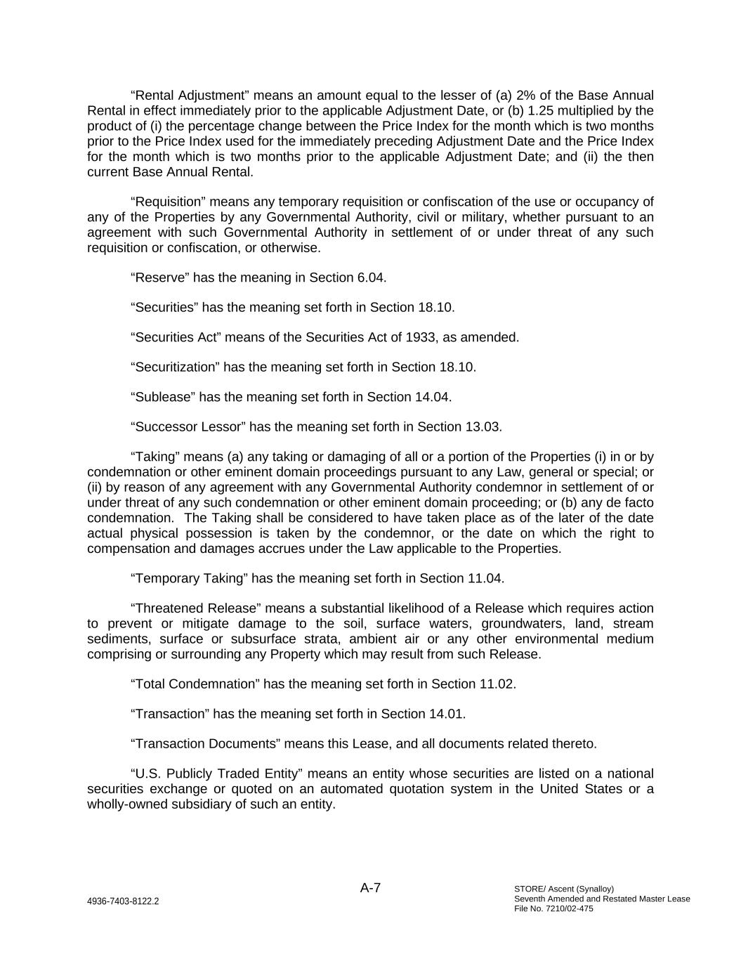 STORE/ Ascent (Synalloy) Seventh Amended and Restated Master Lease File No. 7210/02-475 A-7 4936-7403-8122.2 “Rental Adjustment” means an amount equal to the lesser of (a) 2% of the Base Annual Rental in effect immediately prior to the applicable Adjustment Date, or (b) 1.25 multiplied by the product of (i) the percentage change between the Price Index for the month which is two months prior to the Price Index used for the immediately preceding Adjustment Date and the Price Index for the month which is two months prior to the applicable Adjustment Date; and (ii) the then current Base Annual Rental. “Requisition” means any temporary requisition or confiscation of the use or occupancy of any of the Properties by any Governmental Authority, civil or military, whether pursuant to an agreement with such Governmental Authority in settlement of or under threat of any such requisition or confiscation, or otherwise. “Reserve” has the meaning in Section 6.04. “Securities” has the meaning set forth in Section 18.10. “Securities Act” means of the Securities Act of 1933, as amended. “Securitization” has the meaning set forth in Section 18.10. “Sublease” has the meaning set forth in Section 14.04. “Successor Lessor” has the meaning set forth in Section 13.03. “Taking” means (a) any taking or damaging of all or a portion of the Properties (i) in or by condemnation or other eminent domain proceedings pursuant to any Law, general or special; or (ii) by reason of any agreement with any Governmental Authority condemnor in settlement of or under threat of any such condemnation or other eminent domain proceeding; or (b) any de facto condemnation. The Taking shall be considered to have taken place as of the later of the date actual physical possession is taken by the condemnor, or the date on which the right to compensation and damages accrues under the Law applicable to the Properties. “Temporary Taking” has the meaning set forth in Section 11.04. “Threatened Release” means a substantial likelihood of a Release which requires action to prevent or mitigate damage to the soil, surface waters, groundwaters, land, stream sediments, surface or subsurface strata, ambient air or any other environmental medium comprising or surrounding any Property which may result from such Release. “Total Condemnation” has the meaning set forth in Section 11.02. “Transaction” has the meaning set forth in Section 14.01. “Transaction Documents” means this Lease, and all documents related thereto. “U.S. Publicly Traded Entity” means an entity whose securities are listed on a national securities exchange or quoted on an automated quotation system in the United States or a wholly-owned subsidiary of such an entity.
