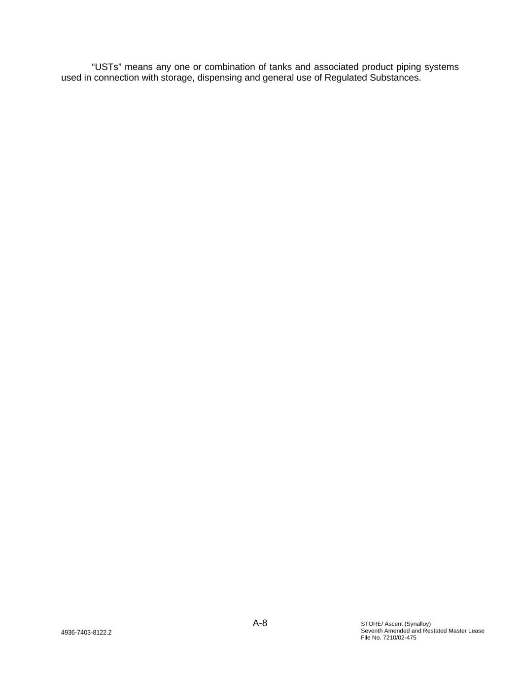 STORE/ Ascent (Synalloy) Seventh Amended and Restated Master Lease File No. 7210/02-475 A-8 4936-7403-8122.2 “USTs” means any one or combination of tanks and associated product piping systems used in connection with storage, dispensing and general use of Regulated Substances.