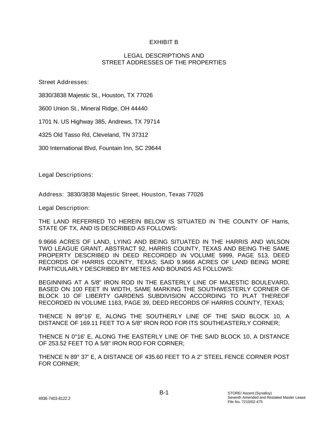 STORE/ Ascent (Synalloy) Seventh Amended and Restated Master Lease File No. 7210/02-475 B-1 4936-7403-8122.2 EXHIBIT B LEGAL DESCRIPTIONS AND STREET ADDRESSES OF THE PROPERTIES Street Addresses: 3830/3838 Majestic St., Houston, TX 77026 3600 Union St., Mineral Ridge, OH 44440 1701 N. US Highway 385, Andrews, TX 79714 4325 Old Tasso Rd, Cleveland, TN 37312 300 International Blvd, Fountain Inn, SC 29644 Legal Descriptions: Address: 3830/3838 Majestic Street, Houston, Texas 77026 Legal Description: THE LAND REFERRED TO HEREIN BELOW IS SITUATED IN THE COUNTY OF Harris, STATE OF TX, AND IS DESCRIBED AS FOLLOWS: 9.9666 ACRES OF LAND, LYING AND BEING SITUATED IN THE HARRIS AND WILSON TWO LEAGUE GRANT, ABSTRACT 92, HARRIS COUNTY, TEXAS AND BEING THE SAME PROPERTY DESCRIBED IN DEED RECORDED IN VOLUME 5999, PAGE 513, DEED RECORDS OF HARRIS COUNTY, TEXAS; SAID 9.9666 ACRES OF LAND BEING MORE PARTICULARLY DESCRIBED BY METES AND BOUNDS AS FOLLOWS: BEGINNING AT A 5/8" IRON ROD IN THE EASTERLY LINE OF MAJESTIC BOULEVARD, BASED ON 100 FEET IN WIDTH, SAME MARKING THE SOUTHWESTERLY CORNER OF BLOCK 10 OF LIBERTY GARDENS SUBDIVISION ACCORDING TO PLAT THEREOF RECORDED IN VOLUME 1163, PAGE 39, DEED RECORDS OF HARRIS COUNTY, TEXAS; THENCE N 89°16' E, ALONG THE SOUTHERLY LINE OF THE SAID BLOCK 10, A DISTANCE OF 169.11 FEET TO A 5/8" IRON ROD FOR ITS SOUTHEASTERLY CORNER; THENCE N 0°16' E, ALONG THE EASTERLY LINE OF THE SAID BLOCK 10, A DISTANCE OF 253.52 FEET TO A 5/8" IRON ROD FOR CORNER; THENCE N 89° 37' E, A DISTANCE OF 435.60 FEET TO A 2" STEEL FENCE CORNER POST FOR CORNER;