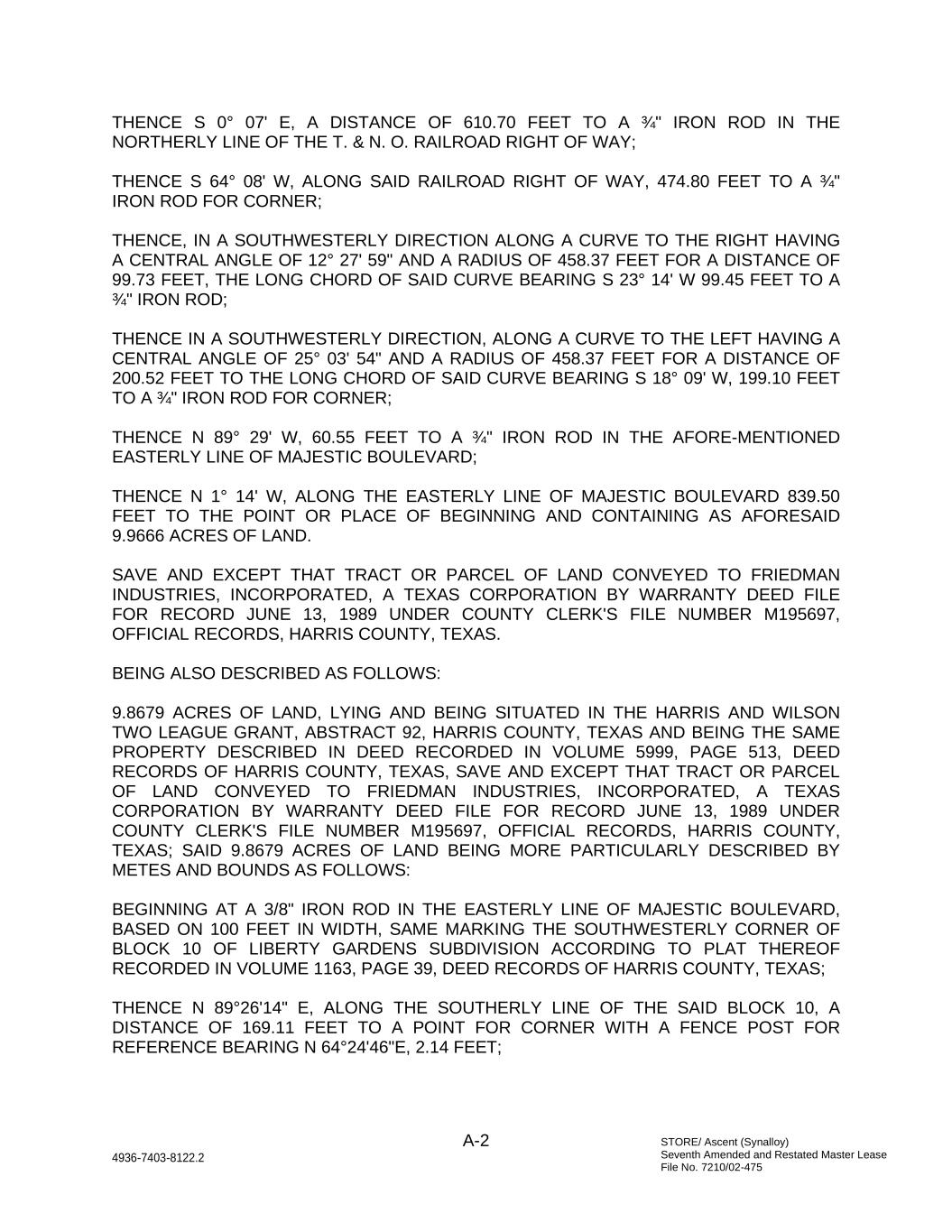 STORE/ Ascent (Synalloy) Seventh Amended and Restated Master Lease File No. 7210/02-475 A-2 4936-7403-8122.2 THENCE S 0° 07' E, A DISTANCE OF 610.70 FEET TO A ¾" IRON ROD IN THE NORTHERLY LINE OF THE T. & N. O. RAILROAD RIGHT OF WAY; THENCE S 64° 08' W, ALONG SAID RAILROAD RIGHT OF WAY, 474.80 FEET TO A ¾" IRON ROD FOR CORNER; THENCE, IN A SOUTHWESTERLY DIRECTION ALONG A CURVE TO THE RIGHT HAVING A CENTRAL ANGLE OF 12° 27' 59" AND A RADIUS OF 458.37 FEET FOR A DISTANCE OF 99.73 FEET, THE LONG CHORD OF SAID CURVE BEARING S 23° 14' W 99.45 FEET TO A ¾" IRON ROD; THENCE IN A SOUTHWESTERLY DIRECTION, ALONG A CURVE TO THE LEFT HAVING A CENTRAL ANGLE OF 25° 03' 54" AND A RADIUS OF 458.37 FEET FOR A DISTANCE OF 200.52 FEET TO THE LONG CHORD OF SAID CURVE BEARING S 18° 09' W, 199.10 FEET TO A ¾" IRON ROD FOR CORNER; THENCE N 89° 29' W, 60.55 FEET TO A ¾" IRON ROD IN THE AFORE-MENTIONED EASTERLY LINE OF MAJESTIC BOULEVARD; THENCE N 1° 14' W, ALONG THE EASTERLY LINE OF MAJESTIC BOULEVARD 839.50 FEET TO THE POINT OR PLACE OF BEGINNING AND CONTAINING AS AFORESAID 9.9666 ACRES OF LAND. SAVE AND EXCEPT THAT TRACT OR PARCEL OF LAND CONVEYED TO FRIEDMAN INDUSTRIES, INCORPORATED, A TEXAS CORPORATION BY WARRANTY DEED FILE FOR RECORD JUNE 13, 1989 UNDER COUNTY CLERK'S FILE NUMBER M195697, OFFICIAL RECORDS, HARRIS COUNTY, TEXAS. BEING ALSO DESCRIBED AS FOLLOWS: 9.8679 ACRES OF LAND, LYING AND BEING SITUATED IN THE HARRIS AND WILSON TWO LEAGUE GRANT, ABSTRACT 92, HARRIS COUNTY, TEXAS AND BEING THE SAME PROPERTY DESCRIBED IN DEED RECORDED IN VOLUME 5999, PAGE 513, DEED RECORDS OF HARRIS COUNTY, TEXAS, SAVE AND EXCEPT THAT TRACT OR PARCEL OF LAND CONVEYED TO FRIEDMAN INDUSTRIES, INCORPORATED, A TEXAS CORPORATION BY WARRANTY DEED FILE FOR RECORD JUNE 13, 1989 UNDER COUNTY CLERK'S FILE NUMBER M195697, OFFICIAL RECORDS, HARRIS COUNTY, TEXAS; SAID 9.8679 ACRES OF LAND BEING MORE PARTICULARLY DESCRIBED BY METES AND BOUNDS AS FOLLOWS: BEGINNING AT A 3/8" IRON ROD IN THE EASTERLY LINE OF MAJESTIC BOULEVARD, BASED ON 100 FEET IN WIDTH, SAME MARKING THE SOUTHWESTERLY CORNER OF BLOCK 10 OF LIBERTY GARDENS SUBDIVISION ACCORDING TO PLAT THEREOF RECORDED IN VOLUME 1163, PAGE 39, DEED RECORDS OF HARRIS COUNTY, TEXAS; THENCE N 89°26'14" E, ALONG THE SOUTHERLY LINE OF THE SAID BLOCK 10, A DISTANCE OF 169.11 FEET TO A POINT FOR CORNER WITH A FENCE POST FOR REFERENCE BEARING N 64°24'46"E, 2.14 FEET;