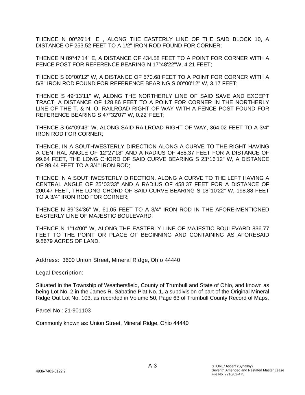 STORE/ Ascent (Synalloy) Seventh Amended and Restated Master Lease File No. 7210/02-475 A-3 4936-7403-8122.2 THENCE N 00°26'14" E , ALONG THE EASTERLY LINE OF THE SAID BLOCK 10, A DISTANCE OF 253.52 FEET TO A 1/2" IRON ROD FOUND FOR CORNER; THENCE N 89°47'14" E, A DISTANCE OF 434.58 FEET TO A POINT FOR CORNER WITH A FENCE POST FOR REFERENCE BEARING N 17°48'22"W, 4.21 FEET; THENCE S 00°00'12" W, A DISTANCE OF 570.68 FEET TO A POINT FOR CORNER WITH A 5/8" IRON ROD FOUND FOR REFERENCE BEARING S 00°00'12" W, 3.17 FEET; THENCE S 49°13'11" W, ALONG THE NORTHERLY LINE OF SAID SAVE AND EXCEPT TRACT, A DISTANCE OF 128.86 FEET TO A POINT FOR CORNER IN THE NORTHERLY LINE OF THE T. & N. O. RAILROAD RIGHT OF WAY WITH A FENCE POST FOUND FOR REFERENCE BEARING S 47°32'07" W, 0.22' FEET; THENCE S 64°09'43" W, ALONG SAID RAILROAD RIGHT OF WAY, 364.02 FEET TO A 3/4" IRON ROD FOR CORNER; THENCE, IN A SOUTHWESTERLY DIRECTION ALONG A CURVE TO THE RIGHT HAVING A CENTRAL ANGLE OF 12°27'18" AND A RADIUS OF 458.37 FEET FOR A DISTANCE OF 99.64 FEET, THE LONG CHORD OF SAID CURVE BEARING S 23°16'12" W, A DISTANCE OF 99.44 FEET TO A 3/4" IRON ROD; THENCE IN A SOUTHWESTERLY DIRECTION, ALONG A CURVE TO THE LEFT HAVING A CENTRAL ANGLE OF 25°03'33" AND A RADIUS OF 458.37 FEET FOR A DISTANCE OF 200.47 FEET, THE LONG CHORD OF SAID CURVE BEARING S 18°10'22" W, 198.88 FEET TO A 3/4" IRON ROD FOR CORNER; THENCE N 89°34'36" W, 61.05 FEET TO A 3/4" IRON ROD IN THE AFORE-MENTIONED EASTERLY LINE OF MAJESTIC BOULEVARD; THENCE N 1°14'00" W, ALONG THE EASTERLY LINE OF MAJESTIC BOULEVARD 836.77 FEET TO THE POINT OR PLACE OF BEGINNING AND CONTAINING AS AFORESAID 9.8679 ACRES OF LAND. Address: 3600 Union Street, Mineral Ridge, Ohio 44440 Legal Description: Situated in the Township of Weathersfield, County of Trumbull and State of Ohio, and known as being Lot No. 2 in the James R. Sabatine Plat No. 1, a subdivision of part of the Original Mineral Ridge Out Lot No. 103, as recorded in Volume 50, Page 63 of Trumbull County Record of Maps. Parcel No : 21-901103 Commonly known as: Union Street, Mineral Ridge, Ohio 44440