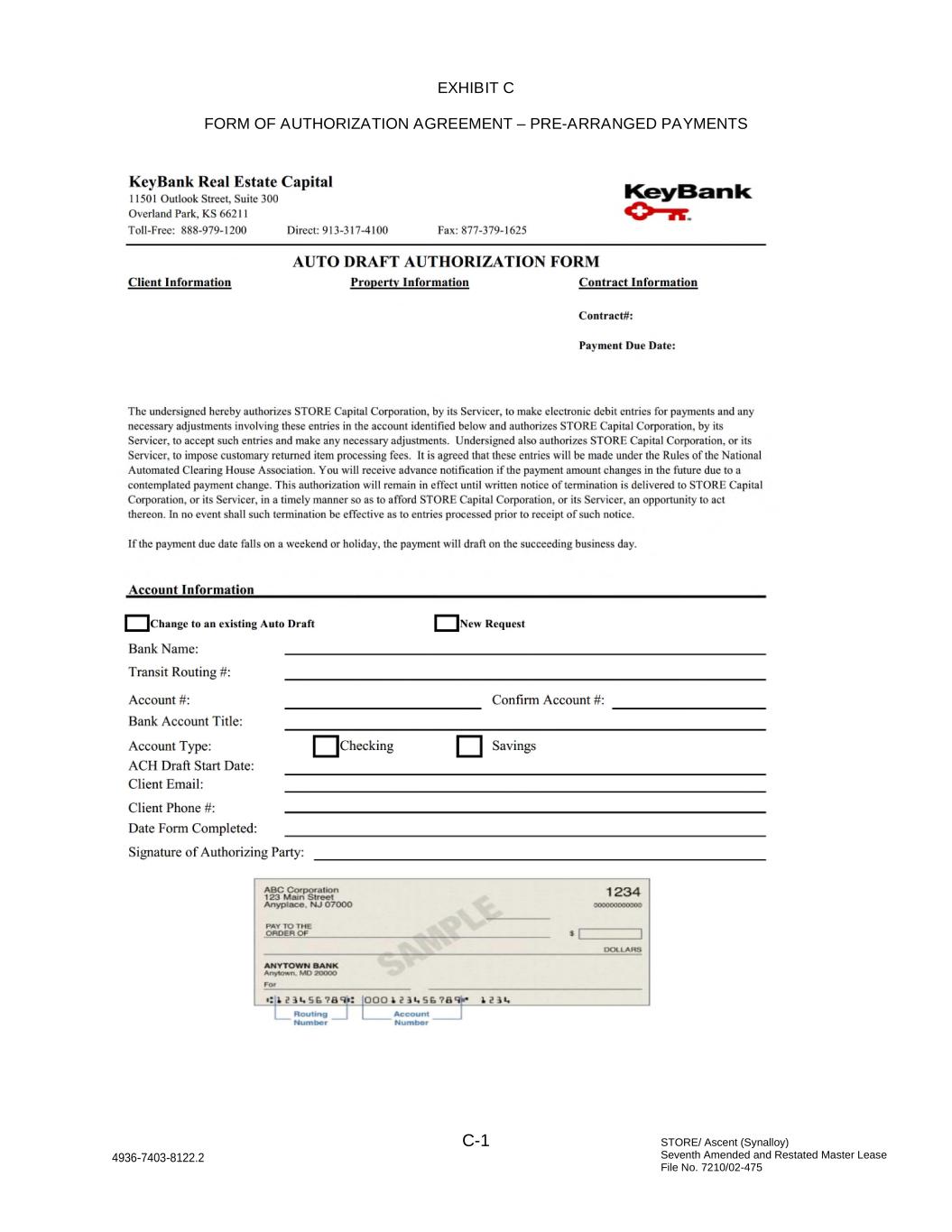 STORE/ Ascent (Synalloy) Seventh Amended and Restated Master Lease File No. 7210/02-475 C-1 4936-7403-8122.2 EXHIBIT C FORM OF AUTHORIZATION AGREEMENT – PRE-ARRANGED PAYMENTS