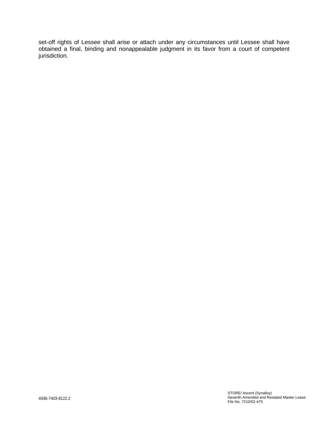 STORE/ Ascent (Synalloy) Seventh Amended and Restated Master Lease File No. 7210/02-475 4936-7403-8122.2 set-off rights of Lessee shall arise or attach under any circumstances until Lessee shall have obtained a final, binding and nonappealable judgment in its favor from a court of competent jurisdiction.