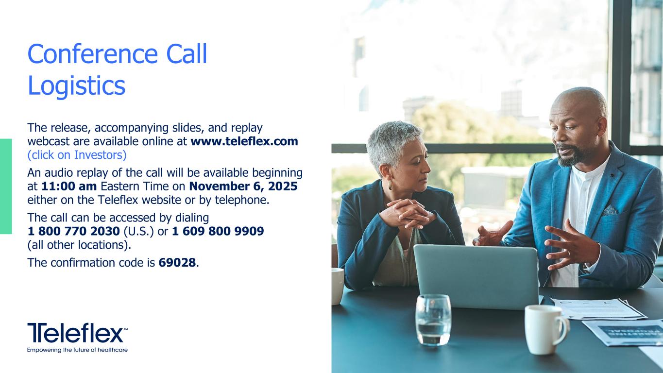 投資家向け電話会議の音声再生は、2025年11月6日午前11時(米国東部時間)より、テレフレックスのウェブサイトまたは電話でご利用いただけます。この電話会議には、1 800 770 2030(米国およびカナダ)または1 609 800 9909(その他の地域)にダイヤルしてアクセスできます。確認コードは69028。
