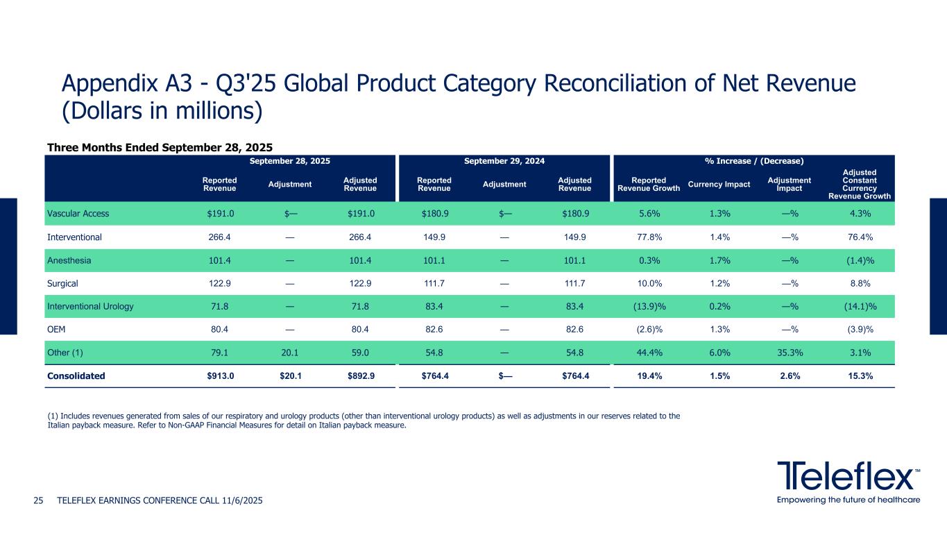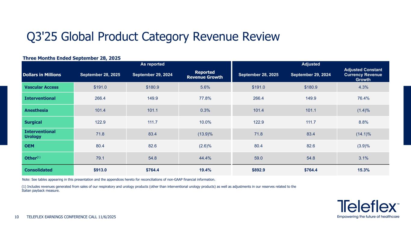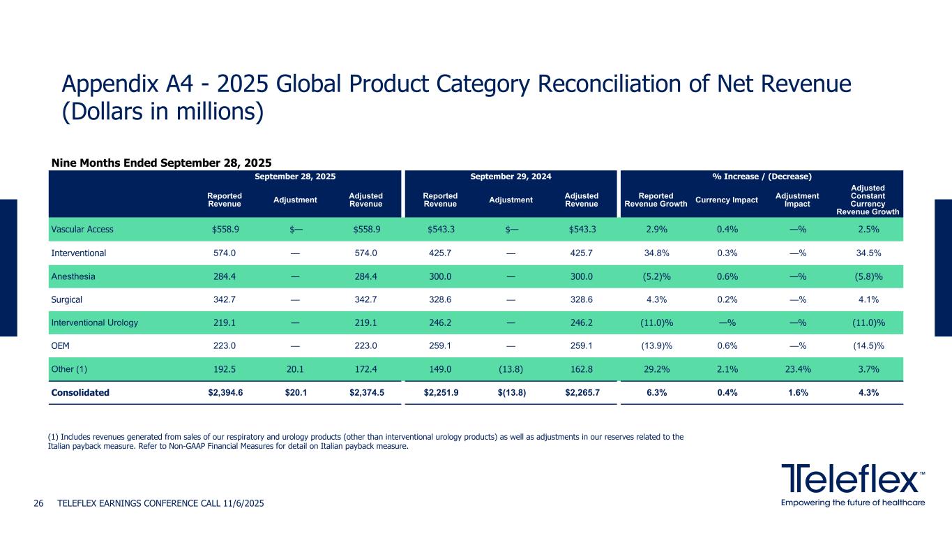 「テレフレックスの会長兼社長兼CEOであるリアム・ケリーは、次のように述べています。「第3四半期は順調に推移し、大動脈内バルーンポンプの受注率が予想を下回ったにもかかわらず、調整後の営業利益率と1株当たり利益は予想を上回り、売上高はガイダンス範囲の中間値を達成しました。「買収した血管インターベンション事業の収益は、ガイダンスの9900万ドルをわずかに上回り、統合活動は順調に進んでいます。テレフレックスをリメインコとニューコという2つの会社に分離することを含め、事業全体で価値創造戦略を着実に進めてきました。NewCoの売却の可能性については、引き続き積極的に進めており、これが当社の主要な焦点となっています。当社は、当社の戦略を実行し、株主価値創造を推進する能力に自信を持っています。以下の表は、2025年9月28日に終了した3ヵ月間および9ヵ月間ならびに前年同期のGAAPベースおよび調整後恒常為替レートベースの各報告対象事業セグメントにおける純収入に関する情報である。