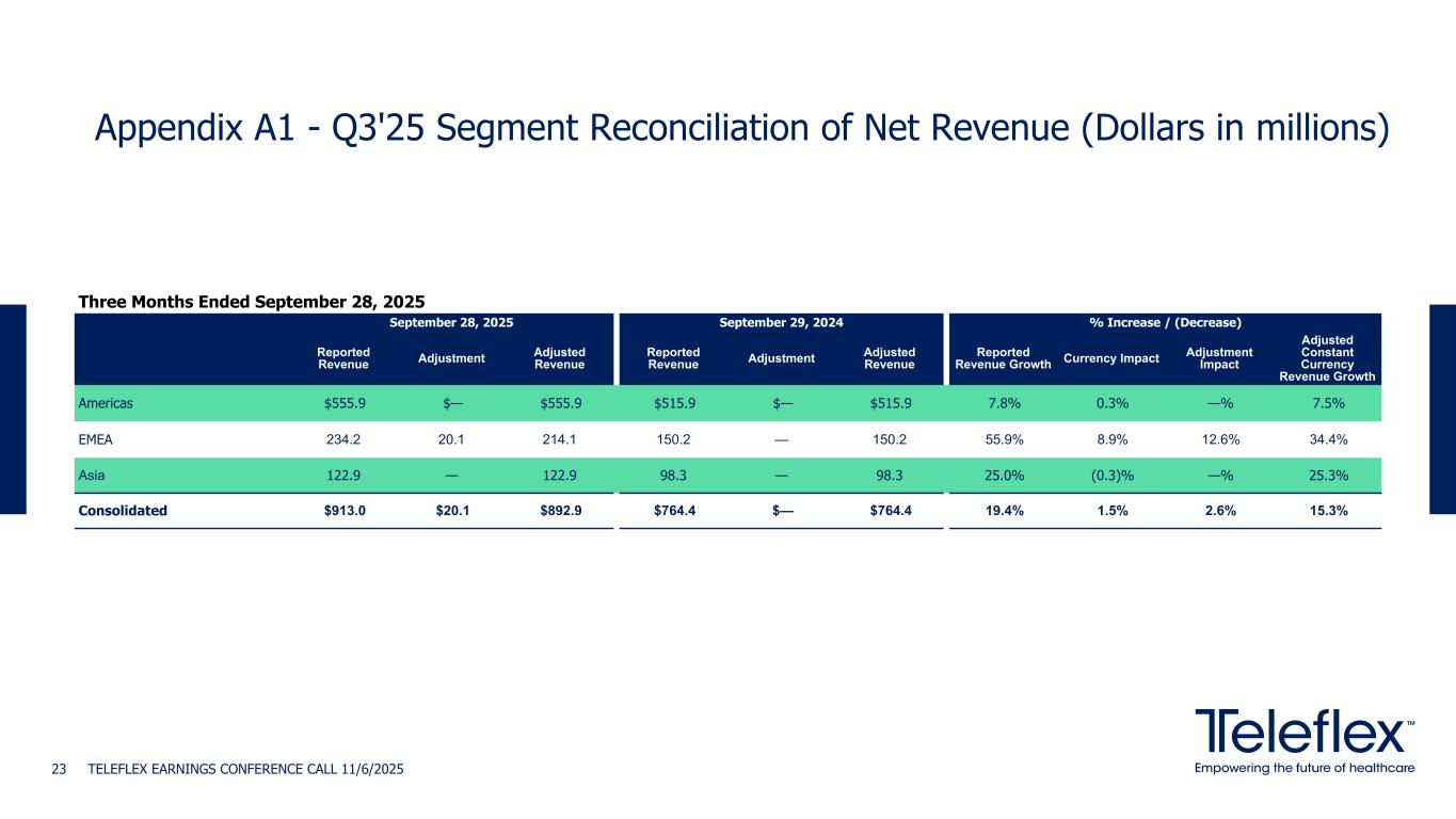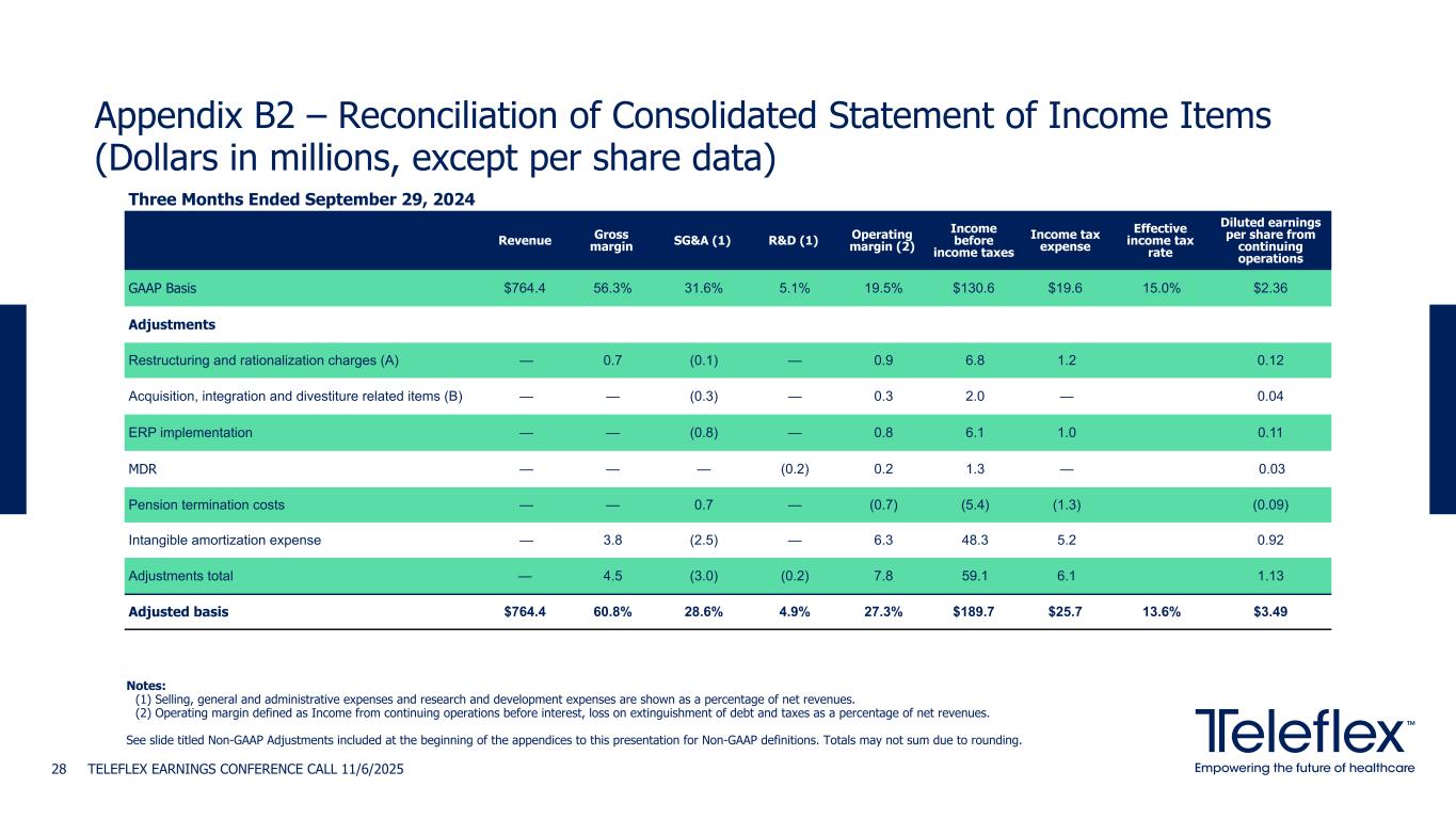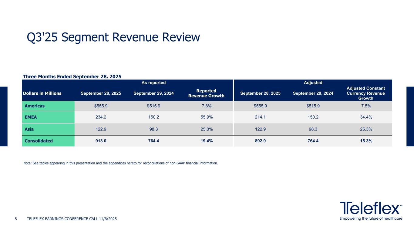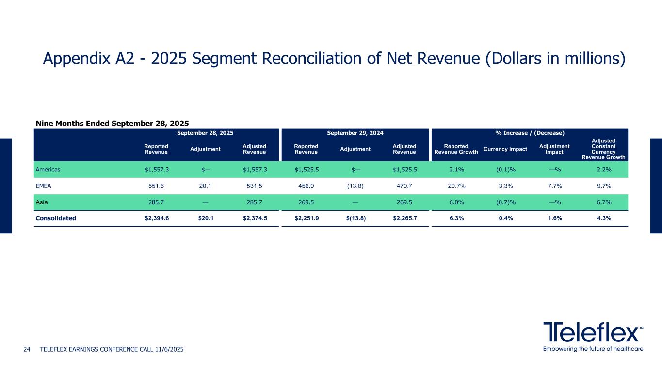 「テレフレックスの会長兼社長兼CEOであるリアム・ケリーは、次のように述べています。「第3四半期は順調に推移し、大動脈内バルーンポンプの受注率が予想を下回ったにもかかわらず、調整後の営業利益率と1株当たり利益は予想を上回り、売上高はガイダンス範囲の中間値を達成しました。「買収した血管インターベンション事業の収益は、ガイダンスの9900万ドルをわずかに上回り、統合活動は順調に進んでいます。テレフレックスをリメインコとニューコという2つの会社に分離することを含め、事業全体で価値創造戦略を着実に進めてきました。NewCoの売却の可能性については、引き続き積極的に進めており、これが当社の主要な焦点となっています。当社は、当社の戦略を実行し、株主価値創造を推進する能力に自信を持っています。以下の表は、2025年9月28日に終了した3ヵ月間および9ヵ月間ならびに前年同期のGAAPベースおよび調整後恒常為替レートベースの各報告対象事業セグメントにおける純収入に関する情報である。