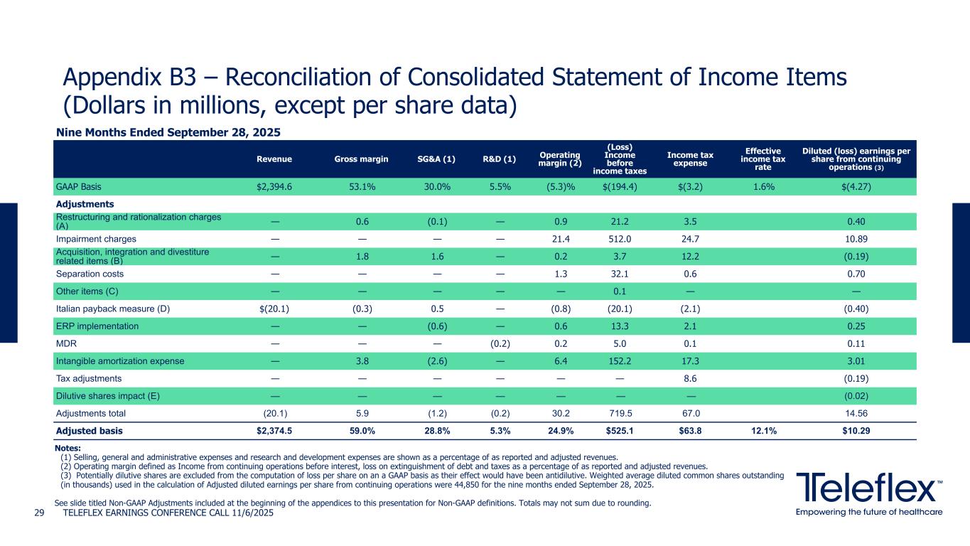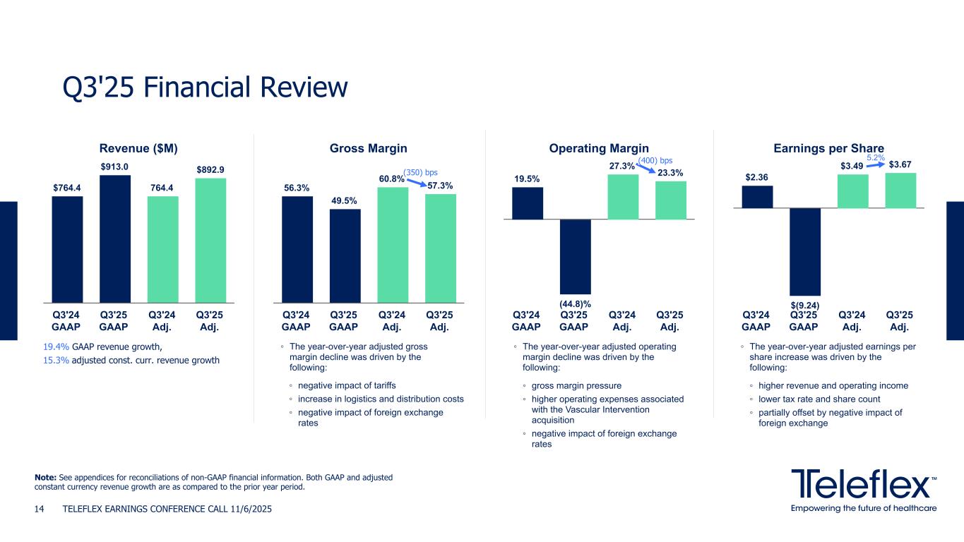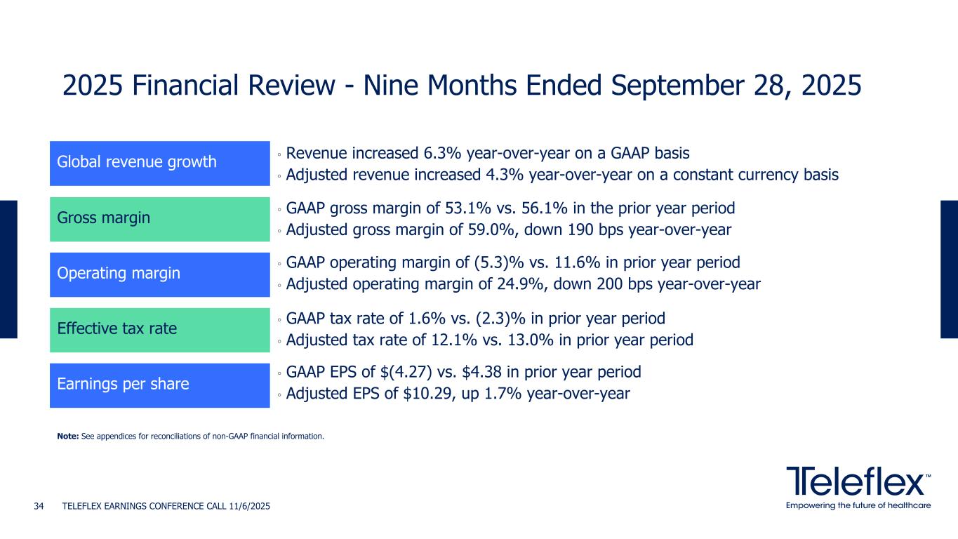 ペンシルベニア州ウェイン--テレフレックス・インコーポレイテッド(NYSE: TFX)(以下「当社」)は本日、2025年9月28日締めの第3四半期決算を発表した。