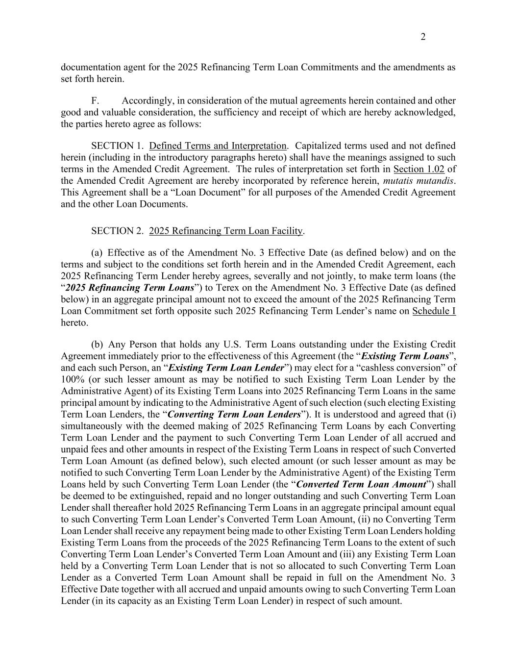 2 documentation agent for the 2025 Refinancing Term Loan Commitments and the amendments as set forth herein. F. Accordingly, in consideration of the mutual agreements herein contained and other good and valuable consideration, the sufficiency and receipt of which are hereby acknowledged, the parties hereto agree as follows: SECTION 1. Defined Terms and Interpretation. Capitalized terms used and not defined herein (including in the introductory paragraphs hereto) shall have the meanings assigned to such terms in the Amended Credit Agreement. The rules of interpretation set forth in Section 1.02 of the Amended Credit Agreement are hereby incorporated by reference herein, mutatis mutandis. This Agreement shall be a “Loan Document” for all purposes of the Amended Credit Agreement and the other Loan Documents. SECTION 2. 2025 Refinancing Term Loan Facility. (a) Effective as of the Amendment No. 3 Effective Date (as defined below) and on the terms and subject to the conditions set forth herein and in the Amended Credit Agreement, each 2025 Refinancing Term Lender hereby agrees, severally and not jointly, to make term loans (the “2025 Refinancing Term Loans”) to Terex on the Amendment No. 3 Effective Date (as defined below) in an aggregate principal amount not to exceed the amount of the 2025 Refinancing Term Loan Commitment set forth opposite such 2025 Refinancing Term Lender’s name on Schedule I hereto. (b) Any Person that holds any U.S. Term Loans outstanding under the Existing Credit Agreement immediately prior to the effectiveness of this Agreement (the “Existing Term Loans”, and each such Person, an “Existing Term Loan Lender”) may elect for a “cashless conversion” of 100% (or such lesser amount as may be notified to such Existing Term Loan Lender by the Administrative Agent) of its Existing Term Loans into 2025 Refinancing Term Loans in the same principal amount by indicating to the Administrative Agent of such election (such electing Existing Term Loan Lenders, the “Converting Term Loan Lenders”). It is understood and agreed that (i) simultaneously with the deemed making of 2025 Refinancing Term Loans by each Converting Term Loan Lender and the payment to such Converting Term Loan Lender of all accrued and unpaid fees and other amounts in respect of the Existing Term Loans in respect of such Converted Term Loan Amount (as defined below), such elected amount (or such lesser amount as may be notified to such Converting Term Loan Lender by the Administrative Agent) of the Existing Term Loans held by such Converting Term Loan Lender (the “Converted Term Loan Amount”) shall be deemed to be extinguished, repaid and no longer outstanding and such Converting Term Loan Lender shall thereafter hold 2025 Refinancing Term Loans in an aggregate principal amount equal to such Converting Term Loan Lender’s Converted Term Loan Amount, (ii) no Converting Term Loan Lender shall receive any repayment being made to other Existing Term Loan Lenders holding Existing Term Loans from the proceeds of the 2025 Refinancing Term Loans to the extent of such Converting Term Loan Lender’s Converted Term Loan Amount and (iii) any Existing Term Loan held by a Converting Term Loan Lender that is not so allocated to such Converting Term Loan Lender as a Converted Term Loan Amount shall be repaid in full on the Amendment No. 3 Effective Date together with all accrued and unpaid amounts owing to such Converting Term Loan Lender (in its capacity as an Existing Term Loan Lender) in respect of such amount.