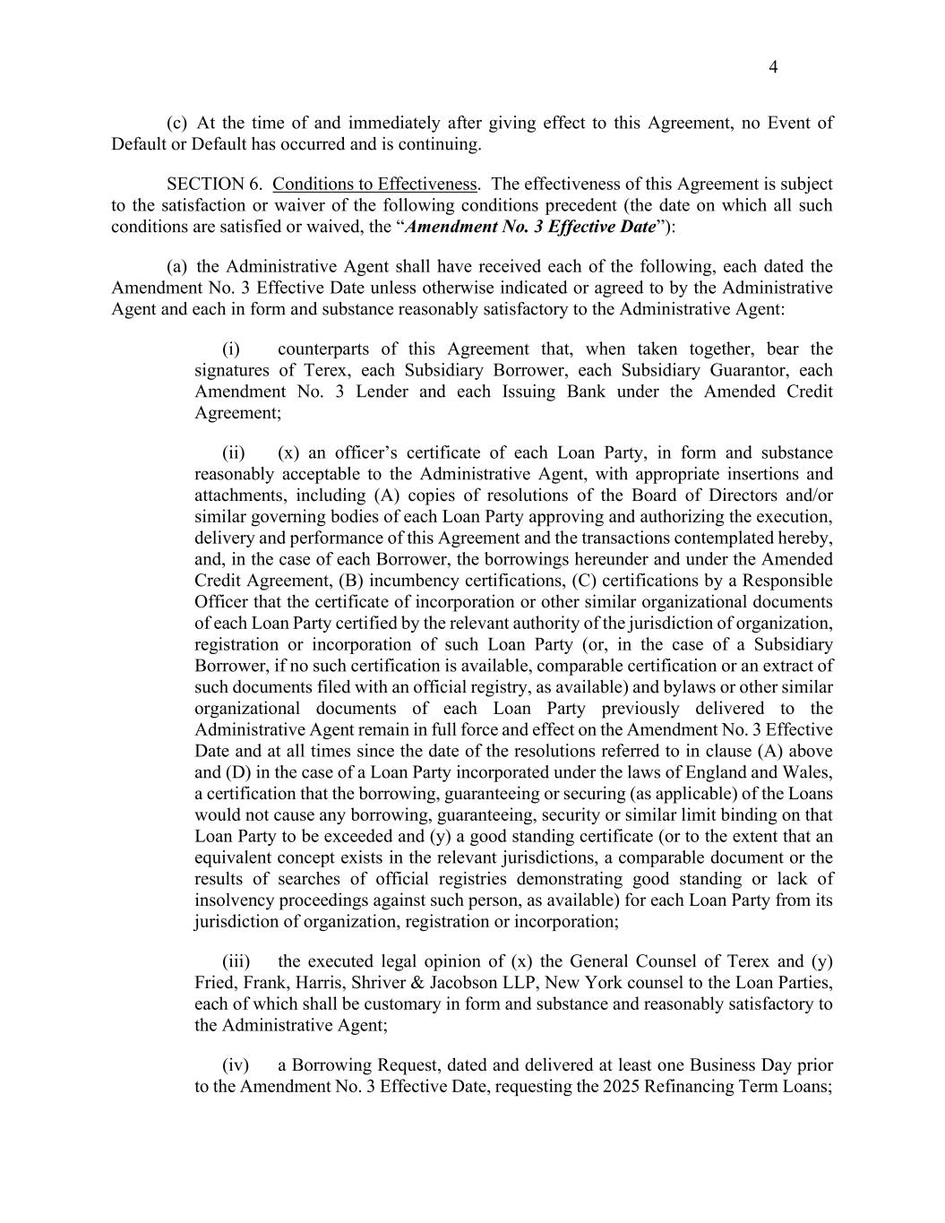 4 (c) At the time of and immediately after giving effect to this Agreement, no Event of Default or Default has occurred and is continuing. SECTION 6. Conditions to Effectiveness. The effectiveness of this Agreement is subject to the satisfaction or waiver of the following conditions precedent (the date on which all such conditions are satisfied or waived, the “Amendment No. 3 Effective Date”): (a) the Administrative Agent shall have received each of the following, each dated the Amendment No. 3 Effective Date unless otherwise indicated or agreed to by the Administrative Agent and each in form and substance reasonably satisfactory to the Administrative Agent: (i) counterparts of this Agreement that, when taken together, bear the signatures of Terex, each Subsidiary Borrower, each Subsidiary Guarantor, each Amendment No. 3 Lender and each Issuing Bank under the Amended Credit Agreement; (ii) (x) an officer’s certificate of each Loan Party, in form and substance reasonably acceptable to the Administrative Agent, with appropriate insertions and attachments, including (A) copies of resolutions of the Board of Directors and/or similar governing bodies of each Loan Party approving and authorizing the execution, delivery and performance of this Agreement and the transactions contemplated hereby, and, in the case of each Borrower, the borrowings hereunder and under the Amended Credit Agreement, (B) incumbency certifications, (C) certifications by a Responsible Officer that the certificate of incorporation or other similar organizational documents of each Loan Party certified by the relevant authority of the jurisdiction of organization, registration or incorporation of such Loan Party (or, in the case of a Subsidiary Borrower, if no such certification is available, comparable certification or an extract of such documents filed with an official registry, as available) and bylaws or other similar organizational documents of each Loan Party previously delivered to the Administrative Agent remain in full force and effect on the Amendment No. 3 Effective Date and at all times since the date of the resolutions referred to in clause (A) above and (D) in the case of a Loan Party incorporated under the laws of England and Wales, a certification that the borrowing, guaranteeing or securing (as applicable) of the Loans would not cause any borrowing, guaranteeing, security or similar limit binding on that Loan Party to be exceeded and (y) a good standing certificate (or to the extent that an equivalent concept exists in the relevant jurisdictions, a comparable document or the results of searches of official registries demonstrating good standing or lack of insolvency proceedings against such person, as available) for each Loan Party from its jurisdiction of organization, registration or incorporation; (iii) the executed legal opinion of (x) the General Counsel of Terex and (y) Fried, Frank, Harris, Shriver & Jacobson LLP, New York counsel to the Loan Parties, each of which shall be customary in form and substance and reasonably satisfactory to the Administrative Agent; (iv) a Borrowing Request, dated and delivered at least one Business Day prior to the Amendment No. 3 Effective Date, requesting the 2025 Refinancing Term Loans;